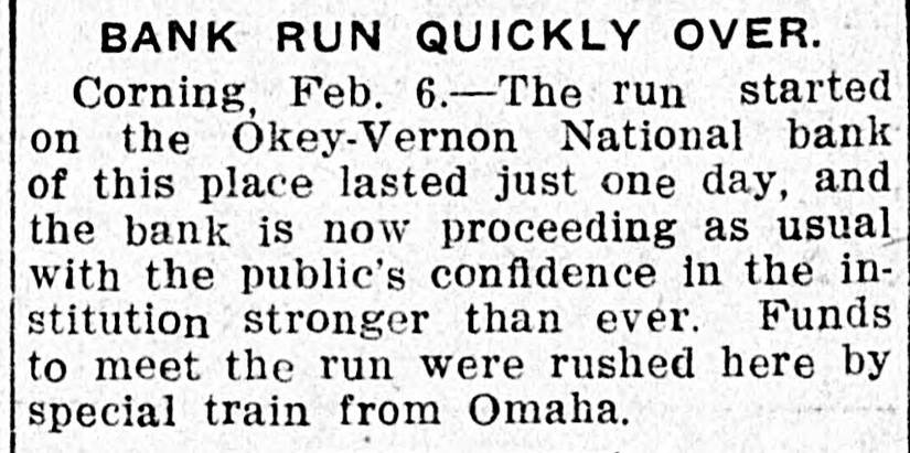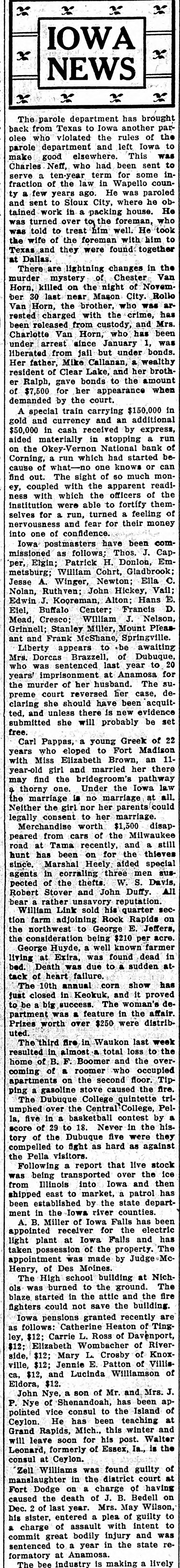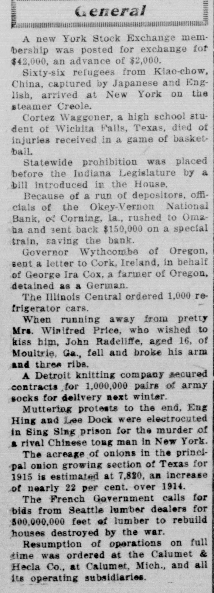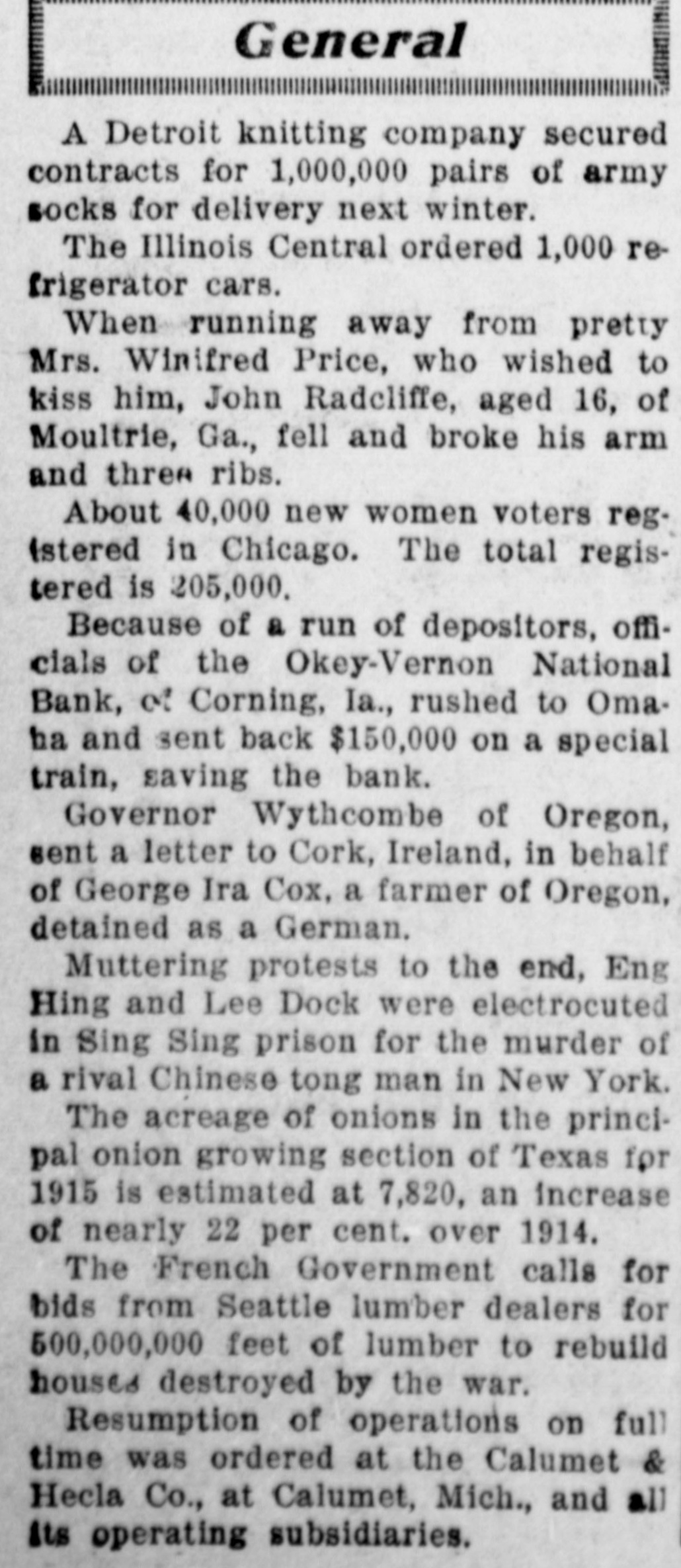THE LEON REPORTER, THURSDAY, FEBRUARY 11, 1 G The doors did not close at 4 o'clock DOG RESCUES MAN. and after that hour all who came to Citizen of Hopeville Narrowly the door were admitted and paid if capes Death by Freezing. t desired. The following is a letter from the E. E. Homewood, a farmer resi U. S. National of Omaha, that was near Hopeville, recently met wit posted in the bank window on Mona very severe accident, but is than day morning: to have escaped as he did. He Omaha, Neb., Jan. 31, 1915. gone to a field about 1 ½ miles f Mr. C. E. Okey, Cashier, his house to chop the ice at the Okey-Vernon National Bank, tle watering place. The cattle cro Corning, Iowa. p ed around, knocking him down Dear Mr. Okey:-By special train breaking his leg below the knee. leaving tomorrow, Monday at 8 a. m., it Homewood was unable to move, we are sending you sufficient funds n fortunately thought of sending for your good bank for any purpose dog home to bring help. Tyin you may need and we will be only y handkerchief around the dog's n too pleased to follow it up with more f he sent him back to the house. so you will be prepared to meet any e wife's attention was attracted by 1 and all demands that may be made e and with the help of neighbors, upon you. e ried the unfortunate man home. Yours very truly, e is reported that Mr. Homewood V. B. Caldwell, President. now resting easy.-Creston Adve The following is a letter from the er-Gazette. bank's correspondent at Chicago and S shows that the local bank can get How People of Iowa Do Live n currency in the Windy City: n Chicago, Jan. 31, 1915. Prosperity and happiness are C .H. Vernon, Esq., President, cardinal prizes sought by every k C. E. Okey, Esq., Cashier, tion, community and individual. S Okey-Vernon National Bank, preamble of the Constitution S Corning, Iowa. forth these two principles, prima Dear Sirs:-If in need of funds for making them a sacred right to et citizen of the United States. To k any purpose during the next few d days, you are at liberty to call on us the degree of happiness and pros for $100,000 to $150,000 on usual ity reached by an individual, stat e terms. Please wire us regarding community, it is but necessary your needs and we will be glad to know how he or they live. How d ship you currency in amounts and dethe people of Iowa live? is asked nominations to suit your requireevery other state in the union, ments. the answer is given, concerning e Assuring you we have every confiIowa farmer in a government sur e dence in your bank and its manageof forty-six farms located in diffe counties. Great care was taker ment, we are Yours faithfully, choosing average farms, in aver t Continental and Commercial Nationcounties, for were the results of n al Bank, by Ralph Van Vechten, investigation of the farms in som Vice President. the richest communities given d C. H. Vernon, president, says that the world would says, "Incredible the bank has never loaned to the ofThough the government stat ficers of the bank, sold a note or borcians have issued figures on the I d rowed money. The owners of the farmer, other investigators have S fined themselves to the cities and bank, the Okeys and Vernons, have several thousand acres of land in this results are such that cannot be county, besides city property and passed by any other state in e personal property. By city banks it great country. There are no large d is considered one of the strong counies in Iowa, and there is no city is not situated in a rich agricult try banks and they were thunderstruck when the report came of the section, for there is no place in I run. that the soil is not highly product This being the situation of the ci Of course there were some funny of the state, there is none but incidents. We are told by an onlookfirst hand access to pure and wh er that a lady and her husband called some products, such as vegetal and she wanted to draw her money meats, milk,-that which makes and he did not. Finally the wife health and happiness, and all thi won. The husband said, "what are S prices that cannot be boosted you going to do with it? and the cause. of freight and express ra lady said if the bald headed demoand various other reasons. crats would leave, including her husTurning to the Iowa farmer, band who was a democrat and bed investigators found that in the a longed to that class, she would put it studied in Iowa the cost of board in her stocking. The democrats left lodging on the farm for each indi and business in the bank suspended ual was on an average of $221 a y during the operation. One depositor This sum included food, fuel, came rushing to town, his team all house rent and house labor, the it lathered with foam, jumped out of being as follows: Food $105 the sleigh and fell down twice in fuel, $14.24; oil, $1.31; house r reaching the bank. Just left the $36.00; house labor, $64.00. To team standing. Many would leave $221.21. The average for all their team at the livery stable and n area of all the states studied is $ say: "Take care of my team; I am Thus the Iowa farmer in an aver going to get my money." During the d county lives 17-26th per cent be day many called on Treasurer E. F. than farmers do elsewhere. Miner and inquired, "Will you take a But why should the people of I "Sure," check on Okey-Vernon?" live better than those of other sta was the reply. They paid their taxes There is but one answer to this q for the year and some had been in tion, and that is that the people the habit of paying the last day, in S the state are wealthy, they can af the afternoon, and then only paying more than the average necessitie one-half, SO the county profited by life. the run. If the wealth in texable prop