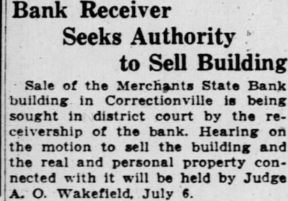 Bank Receiver Seeks Authority to Sell Building Sale of the Merchants State Bank building in Correctionville is being sought district court by the receivership of the bank. Hearing on the motion to sell the building and the real and property connected with it will be held by Judge A. O. Wakefield. July 6.