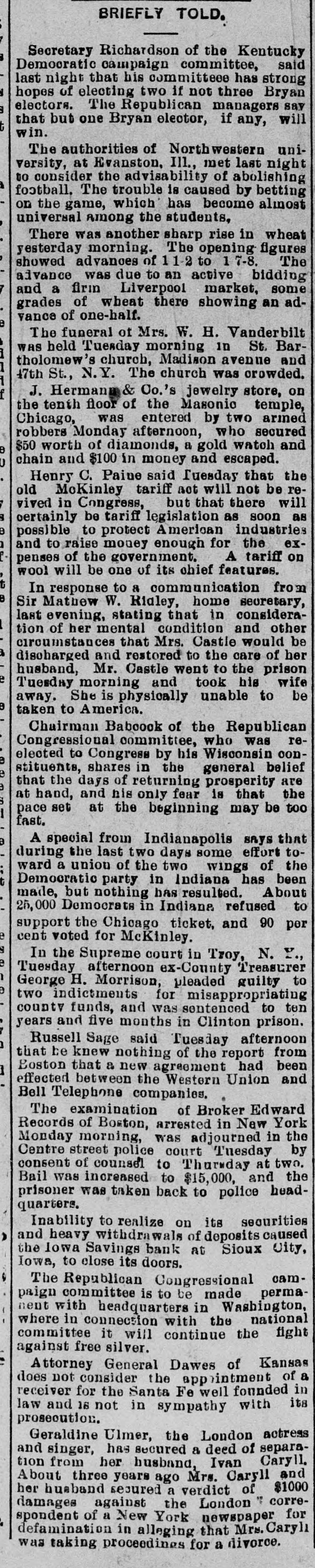 the South Boston police court charged with the murder of his sister, Mrs. Fallon of South Boston on the night of October 31 and was held without bail. There is such activity at the Brooklyn navy yard in completing repairs on warships that United States naval officers believe the government has determined upon a show of force In some quarter. Rev. Alexis Berk, aged 23, has probably perished in the Flathead Mts., Montana. His body is being searched for. He was a circuit rider with 130 miles circuit. His people live in Chicago. Miss Dolly Mollar, of Otsego, Mich., went crazy election night while shouting "Hurrah for McKinley!" Walter Cord, of Macomb township, aged 26, since election has done nothing but shriek "16 to 1." At Manchester, Conn., the big silk mills of the Cheney Bros. began a full time schedule. The works have been running at a reduced time for more than three years. The change affects 2,500 employes. By the explosion of a boiler at the Centralia colliery, Centralia, Pa., on Saturday, John Rovitze and Andrew Munock were killed, and Michael Kulick, John Stenshak and Mathias Lesher were fatally injured. At Lyons, N. Y., the Manhattan silver plate factory has commenced running nights on account of large orders. The New Haven silver plate factory and A. H. Town & Co.'s silver plate factory have both started up on full time. At Lebanon, Ky., William Bean, the negro who assaulted Mrs. L. C. Clark, was captured and carried before Mrs. Clark, who identified him. She is expected to die, but pleaded with the crowd to let the law take its course. He is in jail. Important discoveries regarding the planets Venus and Mercury are made at the Lowell observatory in Arizona. Kentucky republicans and gold democrats in the legislature may unite upon Secretary Carlisle for senator to defeat Blackburn. Governor Oates of Alabama in his annual message asks that the carrying of concealed weapons be made a felony: recites numerous cases of lynching in this state in the last two years, and makes some timely suggestions to the legislature. Dr. James Stinson Wintermute, who moved to Tacoma ten years ago from Chicago, was murdered by Samuel Tucker, a hypochondriac. The latter then committed suicide. Dr. Wintermute had been treating Tucker for melancholia. Incendiaries fired James T. Abbot's house at Hamlin, Va. Cora, his daughter aged 20, was burned to death. She was recently acquitted for alleged blowing up of Squire Vance's house with dynamite, killing one and injuring another. At Bristol, Conn., a business revival is felt and the most notable instance of it is found at the works of the Bristol Brass and Clock Co. The factory will now run overtime. This course is necessary to all orders which have been received. The winter residence and the valuable library of Miss Octava French, 10cated at Elmwood, Ark., were burned. Miss French is better known as Octave Thanet, the novel and magazine writer. The family narrowly escaped. The loss is $12,000. Fire in the five-story huilding. 45 and 47 Federal street, Boston, caused a loss of about $8,000, chiefly to George Coleman, book binder. Heyer Bros toys, etc., and C. F. West, printer, suffered considerable from smoke and water. Coleman's insurance is $5,000. The United States battleship Texas while lying at the cob deck, Brooklyn navy yard. this morning, had a thirteen-inch hole stove in her side, caused by the breaking of her sea cock. and she now lies on the bottom of the dock with her engine room full of water. The Iowa Savings bank, at Sioux City, closed its doors. The steady withdrawal of deposits and inability to realize on securities except at a great sacrifice were the causes of the failure.