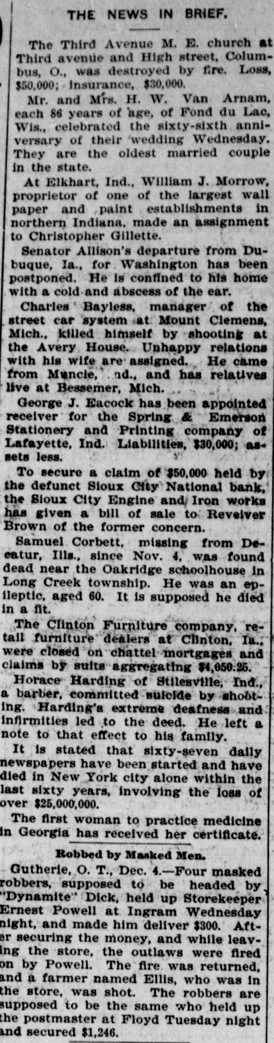 THE NEWS IN BRIEF. The Third Avenue M. E. church at Third avenue and High street, Columbus, O., was destroyed by fire. Loss, $50,000; insurance, $30,000. Mr. and Mrs. H. W. Van Arnam, each 86 years of 'age, of Fond du Lac, Wis., celebrated the sixty-sixth anniversary of their wedding Wednesday. They are the oldest married couple in the state. At Elkhart, Ind., William J. Morrow, proprietor of one of the largest wall paper and paint establishments in northern Indiana, made an assignment to Christopher Gillette. Senator Allison's departure from Dubuque, Ia., for Washington has been postponed. He is confined to his home with a cold and abscess of the ear. Charles Bayless, manager of the street car system at Mount Clemens, Mich., killed himself by shooting at the Avery House. Unhappy relations with his wife are assigned. He came from Muncie, nd., and has relatives live at Bessemer, Mich. George J. Eacock has been appointed receiver for the Spring & Emerson Stationery and Printing company of Lafayette, Ind. Liabilities, $30,000; assets less. To secure a claim of $50,000 held by the defunct Sioux City National bank, the Sioux City Engine and Iron works has given a bill of sale to Reveiver Brown of the former concern. Samuel Corbett, missing from Deeatur, Ills., since Nov. 4, was found dead near the Oakridge schoolhouse in Long Creek township. He was an epileptic, aged 60. It is supposed he died in a fit. The Clinton Furniture company, retail furniture dealers at Clinton, Ia., were closed on chattel mortgages and claims by suits aggregating $4,050.25. Horace Harding of Stilesville, Ind., a barber, committed suicide by shooting. Harding's extreme deafness and infirmities led to the deed. He left a note to that effect to his family. It is stated that sixty-seven daily newspapers have been started and have died in New York city alone within the last sixty years, involving the loss of over $25,000,000. The first woman to practice medicine in Georgia has received her certificate. Robbed by Masked Men. Gutherie, O. T., Dec. 4.-Four masked robbers, supposed to be headed by "Dynamite" Dick, held up Storekeeper Ernest Powell at Ingram Wednesday night, and made him deliver $300. After securing the money, and while leaving the store, the outlaws were fired on by Powell. The fire was returned, and a farmer named Ellis, who was in the store, was shot. The robbers are supposed to be the same who held up the postmaster at Floyd Tuesday night and secured $1,246.