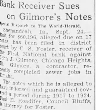 Bank Receiver Sues on Gilmore's Notes Dispatch The Herald. Sept for alleged due on has been filed in district by receiver of First National bank against Gilmore, Chicago Heights, Omaha completed sewer jobs in which he is alleged to indorsed and period during 1917 to 1924 Council Bluffs, attorney for Foster.