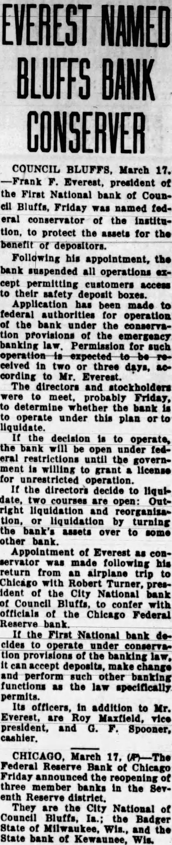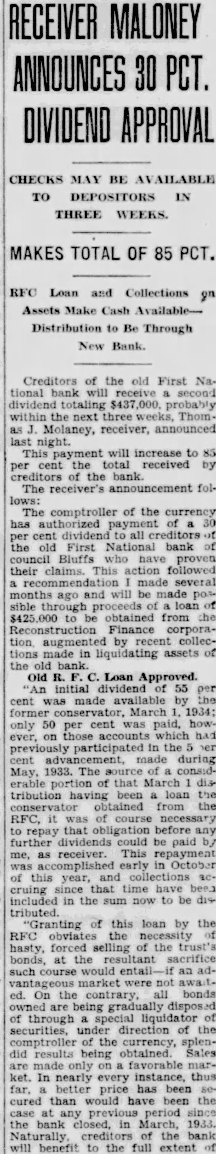 DEPOSITORS RETURN TO STATE SAVINGS PLANS ARE BEING MADE FOR REORGANIZATION OF BANK. FLURRY HAS SUBSIDED While plans for reogranization under the state banking stabilization law were being perfected by officials of the State Savings bank under direction of the state bank. ing department, other banks of the city Wednesday were doing routine business, with little to remind them of the flurry of withdrawal which the closing and reopening of the State Savings bank Tuesday Patrons of the State Savings bank were redepositing their money there this morning under the reorganization, and at the other banks the usual banking business was being done, deposits were coming in about normal volume and the banks were cashing checks, issuing drafts, etc., in the regular course of business. Plans for the reorganization of the bank are still indefinite. No effort has been made as yet to secure according to W. S. Baird, vice president, and no trustees have been appointed yet to take over the old affairs of the bank. Probably it will be three or four days before action can be taken on these matters. City, county and school funds which deposited in the State Savings bank are protected under the bank guarantee law. No definite date can be given as to when the bank will begin to pay off depositors, Baird said, but it will be as soon as possible. Meanwhile at other banks the flurry of withdrawals had subsided. G. Turner, chairman of the board of directors of the City Na. tional bank, announced that the "run" had touched the bank only "The last day of February and the frst day March are always heavy days in this bank," he said. "Of course there were some withdrawals, but they were mostly of the smaller savings depositors and many of them have again deposited their funds in the bank." A small line of persons was waiting at the statement window at 11 a. m., but the other windows seemed no busier than usual. Roy Maxfield, vice president of First National bank, also said ceased. that withdrawals had practically "We are prepared to pay all those who want their money," he declared, "but reason to believe that the panic which always follows closing of a bank has sub sided. "The people of Council Bluffs have no reason to fear any bank in the city. "The big run of withdrawals was taken care of Tuesday without trouble, B. A. Gronstall, vice president of the Council Bluffs Savings banks, declared. Today everything is going along in the normal way.'