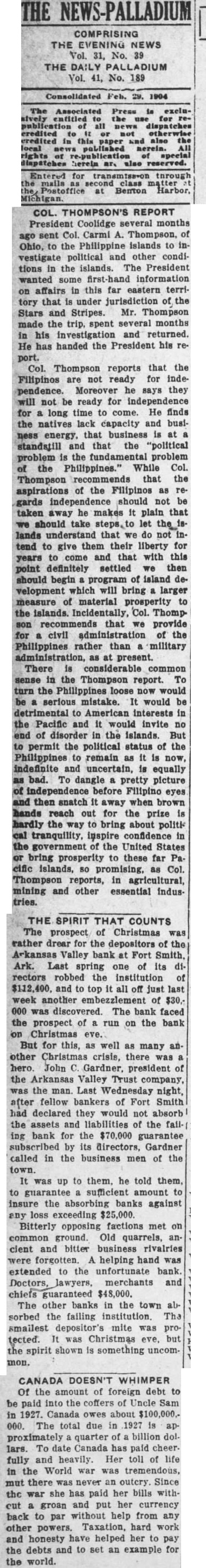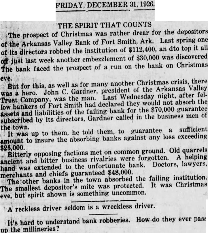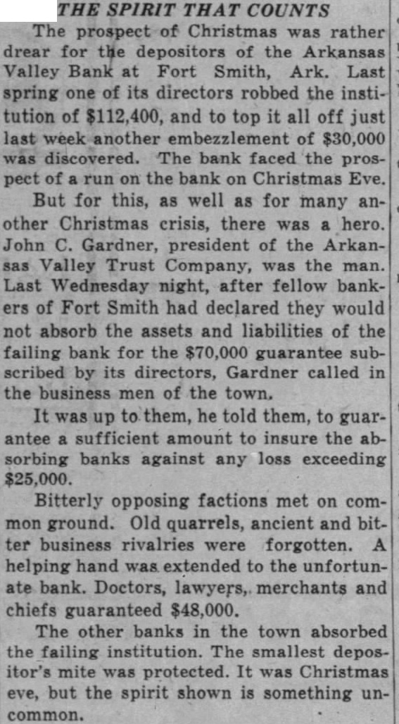 FT. SMITH BANK QUITS FOLLOWING A SHORTAGE AND OFFICIAL ROBBERY Ft. Smith, Dec. kansas Valley Bank depositors this morning were being paid in full, under the direction of John C. Gardner, who is acting as agent for the First National Bank and the Merchants National Bank, which last night took over the assets and liabilities of the Arkansas Valley. The institution was absorbed by its sister banks after the disocvery of a $30,000 shortage in the accounts of F. L. Sprinkle, bookkeeper of the Arkansas Vaalley Bank. The alleged defalcation. coming after the $12,400 robbery of the bank last January by M. M. Hayes, inactive vice-president, made it impossible, in the opinion of the bank directors, to retain public confidence in the operation of the bank's affairs, and the institution formally went out fo business last night. Hayes is serving a term in the Arkansas penitentiary. To facilitate liquidation, directors of the Arkansas Valley Bank subscribed $70,000. the First National and the Merchants National Bank assumed a liability for $25,000. and Fort Smith business men called into the conference, subscribed a guarantee fund of $40,000 to indemnify the the two banks againsst any loss to them exceeding $25,000. The City National Bank contributed $5,000 tc minimize-any possible loss to absorbing banks. President Hugh Branzon, of the Arkansas Valley Bank, said that Sprinkle, in a signed confession, admitted embezzlement during the last three years, but most of the $30,000 he was short was taken in the last few months. As an offset to his shortage, he has deposits aggregating $4,900." Information charging embezzle ment was filed against Sprinkle to day in municipal court by D. L Ford, assstant prosecuting attorney and bond was fixed at $7,000, and was signed by Sprinkle's father, J W. Sprinkle Fort Smith, and J.H Cole of Alma, an uncle. Preliminary hearing was set for 10 o'clock Dec ember 28. Sprinkle went to the sheriff's of fice about 11 o'clock in company of his father and surrendered to Sher iff Pink Shaw. The sheriff called Attorney Ford and bond was signed about 30 minutes later. Sprinkle de clined to make any statement. Little Rock, Ark., Dec. 23. (AP) -The State Banking Department has been working on the absorption of the Arkansas Valley Bank at Fort Smith by other institutions or that city for several days Loid Rainwater bank commissioner said today. "We were notified last Sunday of the shortage in the Arkansas Valley Bank and since have been trying to wor kout a plan with other Fort Sm banks whereby it would be taken over," he said. "It is a source of satisfaction to the banking de pa (ment that other banks and businews men of that city have come to its aid and prevented any loss to de positors and creditors.'