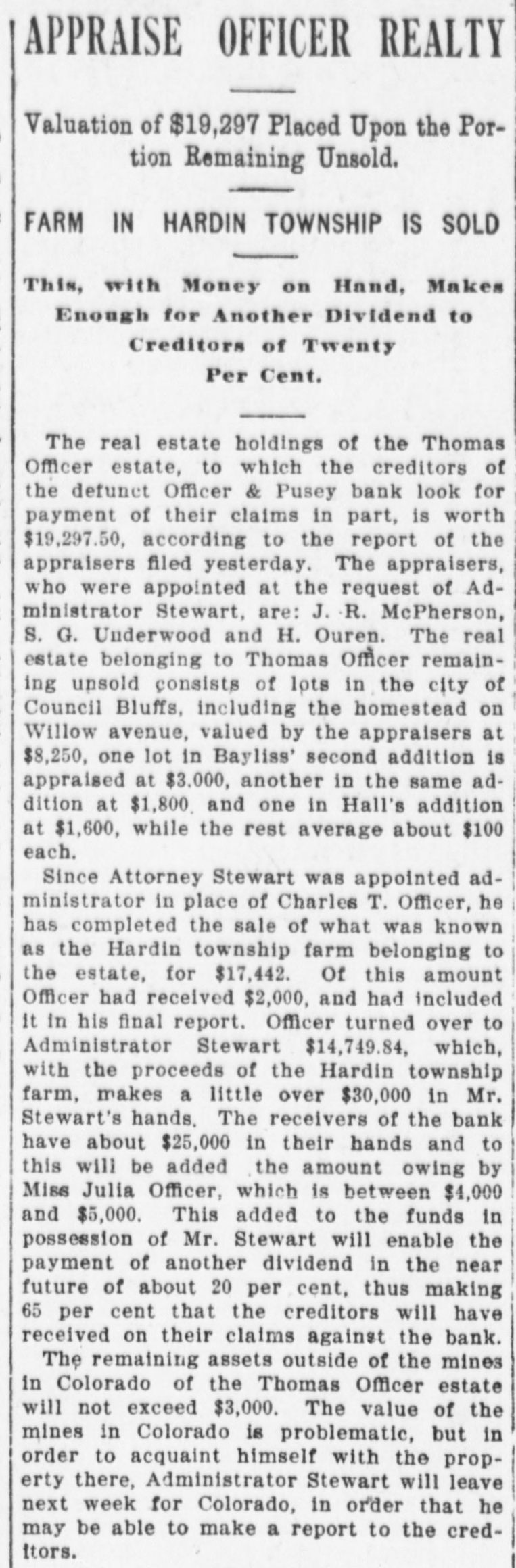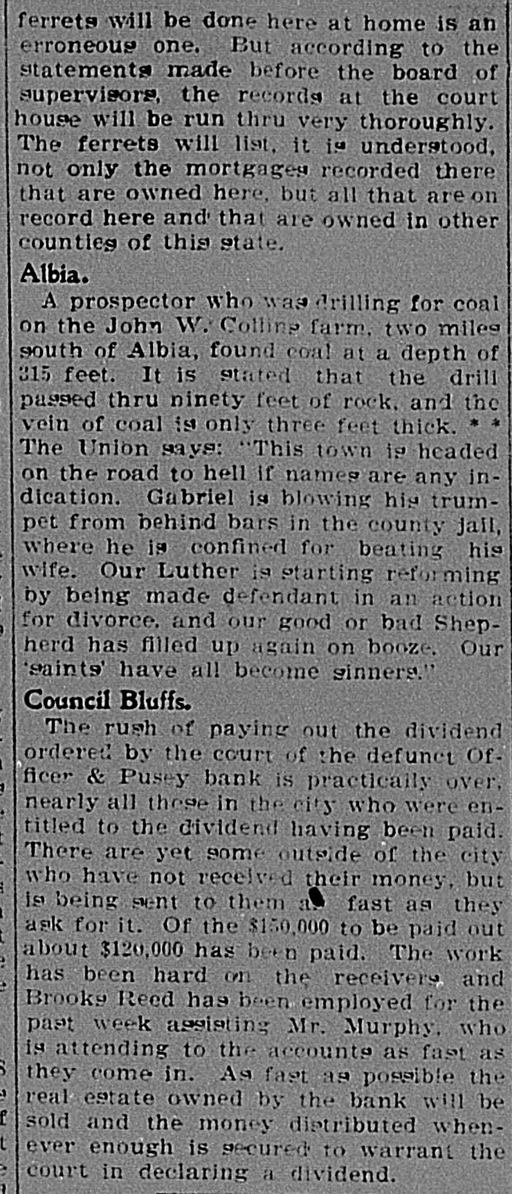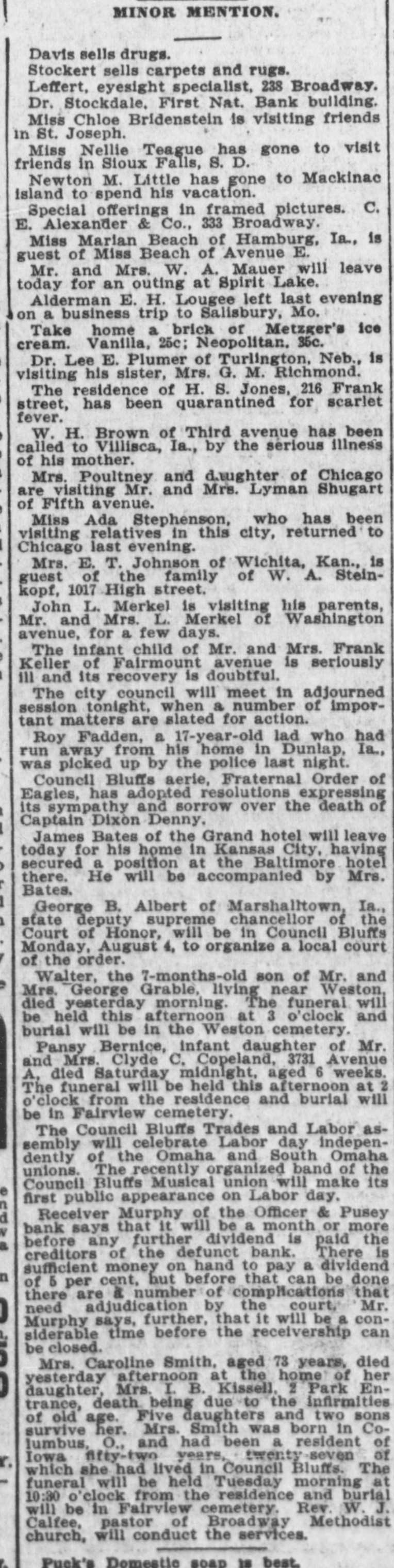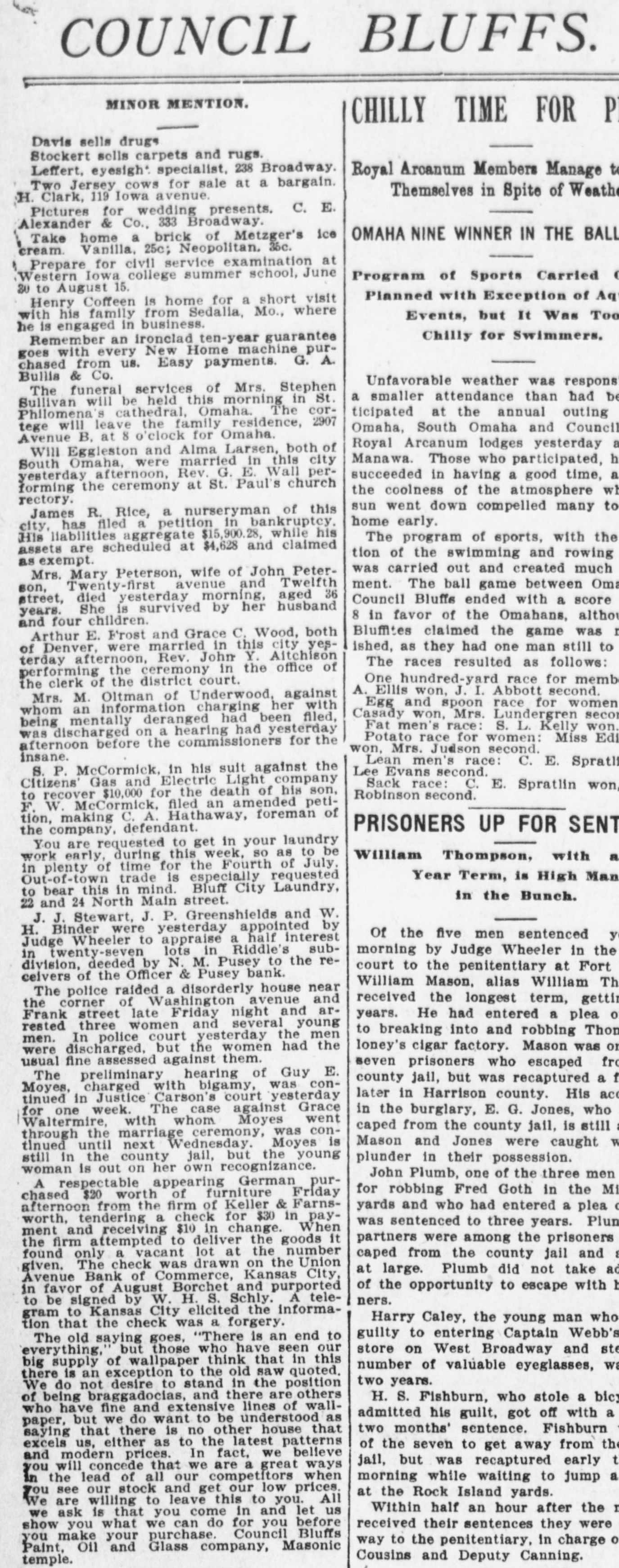 COUNCIL BLUFFS. MINOR MENTION. CHILLY TIME FOR P Davis sells drugs Stockert sells carpets and rugs. Leffert, eyesight specialist, 238 Broadway. Royal Arcanum Members Manage to Two Jersey cows for sale at a bargain. Themselves in Spite of Weath H. Clark, 119 Iowa avenue. Pictures for wedding presents. C. E. Alexander & Co., 333 Broadway. OMAHA NINE WINNER IN THE BALL Take home a brick of Metzger's ice cream. Vanilla, 25c; Neopolitan. 35c. Prepare for civil service examination at Western Iowa college summer school, June Program of Sports Carried e 30 to August 15. Planned with Exception of Aq Henry Coffeen is home for a short visit with his family from Sedalia, Mo., where Events, but It Was Too he is engaged in business. Chilly for Swimmers. Remember an ironclad ten-year guarantee goes with every New Home machine purchased from us. Easy payments. G. A. Bullis & Co. Unfavorable weather was respons The funeral services of Mrs. Stephen a smaller attendance than had be Sullivan will be held this morning in St. ticipated at the annual outing Philomena's cathedral, Omaha. The cortege will leave the family residence, 2907 Omaha, South Omaha and Council Avenue B, at 8 o'clock for Omaha. Royal Arcanum lodges yesterday a Will Eggleston and Alma Larsen, both of Manawa. Those who participated, h South Omaha, were married in this city succeeded in having a good time, a yesterday afternoon, Rev. G. E. Wall performing the ceremony at St. Paul's church the coolness of the atmosphere w rectory. sun went down compelled many to James R. Rice, a nurseryman of this home early. city, has filed a petition in bankruptcy, His liabilities aggregate $15,900.28, while his The program of sports, with the assets are scheduled at $4,628 and claimed tion of the swimming and rowing as exempt. was carried out and created much Mrs. Mary Peterson, wife of John Peterment. The ball game between Oma son, Twenty-first avenue and Twelfth street, died yesterday morning, aged 36 Council Bluffs ended with a score years. She is survived by her husband 8 in favor of the Omahans, althou and four children. Bluffites claimed the game was I Arthur E. Frost and Grace C. Wood, both ished, as they had one man still to of Denver, were married in this city yesterday afternoon, Rev. John Y. Altchison The races resulted as follows: performing the ceremony in the office of One hundred-yard race for memb the clerk of the district court. A. Ellis won, J. I. Abbott second. Mrs. M. Oltman of Underwood, against Egg and spoon race for women whom an information charging her with Casady won, Mrs. Lundergren seco being mentally deranged had been filed, Fat men's race: S. L. Kelly won. was discharged on a hearing had yesterday Potato race for women: Miss Edi afternoon before the commissioners for the won, Mrs. Judson second. insane. Lean men's race: C. E. Sprath S. P. McCormick, in his suit against the Lee Evans second. Citizens' Gas and Electric Light company Sack race: C. E. Spratlin won, to recover $10,000 for the death of his son, Robinson second. F. W. McCormick, filed an amended petition, making C. A. Hathaway, foreman of PRISONERS UP FOR SENT the company, defendant. You are requested to get in your laundry work early, during this week, so as to be William Thompson, with a in plenty of time for the Fourth of July, Year Term, is High Man Out-of-town trade is especially requested to bear this in mind. Bluff City Laundry, in the Bunch. 22 and 24 North Main street. J. J. Stewart, J. P. Greenshields and W. H. Binder were yesterday appointed by Of the five men sentenced y Judge Wheeler to appraise a half interest morning by Judge Wheeler in the in twenty-seven lots in Riddle's subdivision, deeded by N. M. Pusey to the recourt to the penitentiary at Fort celvers of the Officer & Pusey bank. William Mason, alias William Th The police raided a disorderly house near received the longest term, gettin the corner of Washington avenue and Frank street late Friday night and aryears. He had entered a plea o rested three women and several young to breaking into and robbing Thon men. In police court yesterday the men loney's cigar factory. Mason was or were discharged, but the women had the usual fine assessed against them. seven prisoners who escaped fro The preliminary hearing of Guy E. county jail, but was recaptured a f Moyes, charged with bigamy, was conlater in Harrison county. His ac tinued in Justice Carson's court yesterday for one week. The case against Grace in the burglary, E. G. Jones, who Waltermire, with whom Moyes went : caped from the county jail, is still through the marriage ceremony, was conMason and Jones were caught W tinued until next Wednesday. Moyes is still in the county jail, but the young plunder in their possession. woman is out on her own recognizance. John Plumb, one of the three men A respectable appearing German purfor robbing Fred Goth in the Mi chased $20 worth of furniture Friday afternoon from the firm of Keller & Farnsyards and who had entered a plea o worth, tendering a check for $30 in paywas sentenced to three years. Plun ment and receiving $10 in change. When partners were among the prisoners the firm attempted to deliver the goods it caped from the county jail and 8 found only a vacant lot at the number given. The check was drawn on the Union at large. Plumb did not take ad Avenue Bank of Commerce, Kansas City, of the opportunity to escape with b in favor of August Borchet and purported ners. to be signed by W. H. S. Schly. A telegram to Kansas City elicited the informaHarry Caley, the young man who tion that the check was a forgery. guilty to entering Captain Webb's The old saying goes, "There is an end to store on West Broadway and ste everything, but those who have seen our big supply of wallpaper think that in this number of valuable eyeglasses, W there is an exception to the old saw quoted. two years. We do not desire to stand in the position of being braggadocias, and there are others H. S. Fishburn, who stole a bic who