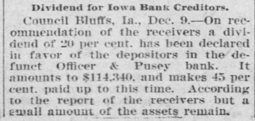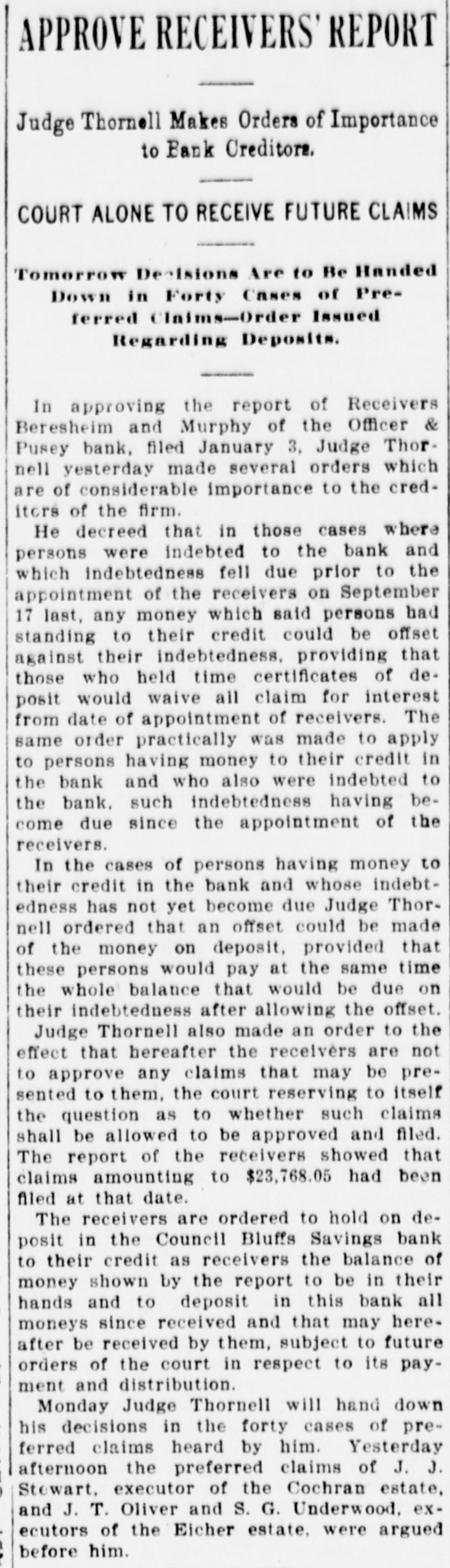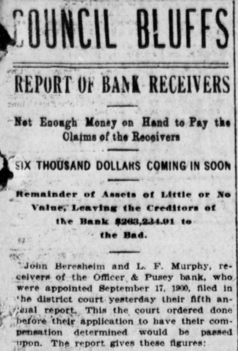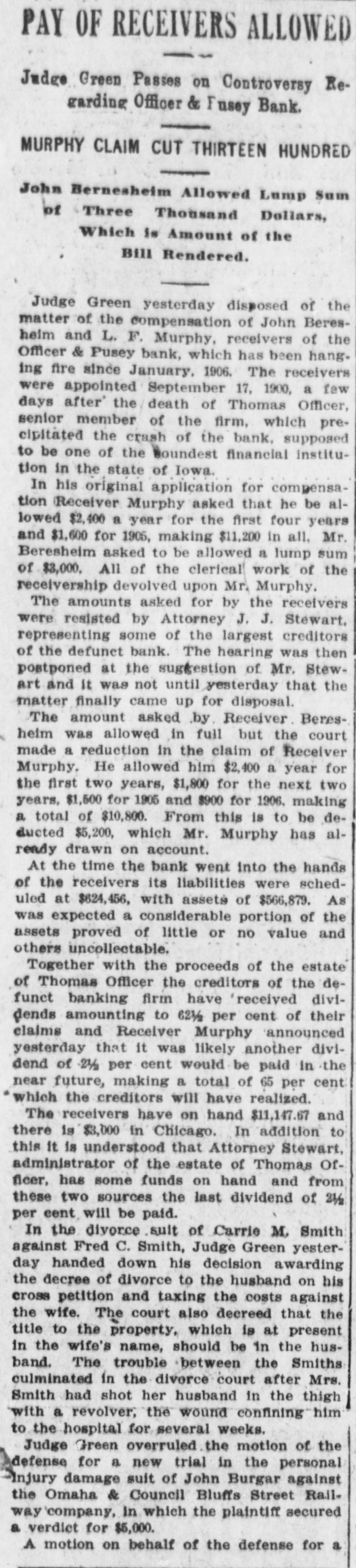 COUNCIL BLUFFS. MINOR MENTION. CHILLY TIME FOR P Davis sells drugs Stockert sells carpets and rugs. Leffert, eyesight specialist, 238 Broadway. Royal Arcanum Members Manage to Two Jersey cows for sale at a bargain. Themselves in Spite of Weath H. Clark, 119 Iowa avenue. Pictures for wedding presents. C. E. Alexander & Co., 333 Broadway. OMAHA NINE WINNER IN THE BALL Take home a brick of Metzger's ice cream. Vanilla, 25c; Neopolitan. 35c. Prepare for civil service examination at Western Iowa college summer school, June Program of Sports Carried e 30 to August 15. Planned with Exception of Aq Henry Coffeen is home for a short visit with his family from Sedalia, Mo., where Events, but It Was Too he is engaged in business. Chilly for Swimmers. Remember an ironclad ten-year guarantee goes with every New Home machine purchased from us. Easy payments. G. A. Bullis & Co. Unfavorable weather was respons The funeral services of Mrs. Stephen a smaller attendance than had be Sullivan will be held this morning in St. ticipated at the annual outing Philomena's cathedral, Omaha. The cortege will leave the family residence, 2907 Omaha, South Omaha and Council Avenue B, at 8 o'clock for Omaha. Royal Arcanum lodges yesterday a Will Eggleston and Alma Larsen, both of Manawa. Those who participated, h South Omaha, were married in this city succeeded in having a good time, a yesterday afternoon, Rev. G. E. Wall performing the ceremony at St. Paul's church the coolness of the atmosphere w rectory. sun went down compelled many to James R. Rice, a nurseryman of this home early. city, has filed a petition in bankruptcy, His liabilities aggregate $15,900.28, while his The program of sports, with the assets are scheduled at $4,628 and claimed tion of the swimming and rowing as exempt. was carried out and created much Mrs. Mary Peterson, wife of John Peterment. The ball game between Oma son, Twenty-first avenue and Twelfth street, died yesterday morning, aged 36 Council Bluffs ended with a score years. She is survived by her husband 8 in favor of the Omahans, althou and four children. Bluffites claimed the game was I Arthur E. Frost and Grace C. Wood, both ished, as they had one man still to of Denver, were married in this city yesterday afternoon, Rev. John Y. Altchison The races resulted as follows: performing the ceremony in the office of One hundred-yard race for memb the clerk of the district court. A. Ellis won, J. I. Abbott second. Mrs. M. Oltman of Underwood, against Egg and spoon race for women whom an information charging her with Casady won, Mrs. Lundergren seco being mentally deranged had been filed, Fat men's race: S. L. Kelly won. was discharged on a hearing had yesterday Potato race for women: Miss Edi afternoon before the commissioners for the won, Mrs. Judson second. insane. Lean men's race: C. E. Sprath S. P. McCormick, in his suit against the Lee Evans second. Citizens' Gas and Electric Light company Sack race: C. E. Spratlin won, to recover $10,000 for the death of his son, Robinson second. F. W. McCormick, filed an amended petition, making C. A. Hathaway, foreman of PRISONERS UP FOR SENT the company, defendant. You are requested to get in your laundry work early, during this week, so as to be William Thompson, with a in plenty of time for the Fourth of July, Year Term, is High Man Out-of-town trade is especially requested to bear this in mind. Bluff City Laundry, in the Bunch. 22 and 24 North Main street. J. J. Stewart, J. P. Greenshields and W. H. Binder were yesterday appointed by Of the five men sentenced y Judge Wheeler to appraise a half interest morning by Judge Wheeler in the in twenty-seven lots in Riddle's subdivision, deeded by N. M. Pusey to the recourt to the penitentiary at Fort celvers of the Officer & Pusey bank. William Mason, alias William Th The police raided a disorderly house near received the longest term, gettin the corner of Washington avenue and Frank street late Friday night and aryears. He had entered a plea o rested three women and several young to breaking into and robbing Thon men. In police court yesterday the men loney's cigar factory. Mason was or were discharged, but the women had the usual fine assessed against them. seven prisoners who escaped fro The preliminary hearing of Guy E. county jail, but was recaptured a f Moyes, charged with bigamy, was conlater in Harrison county. His ac tinued in Justice Carson's court yesterday for one week. The case against Grace in the burglary, E. G. Jones, who Waltermire, with whom Moyes went : caped from the county jail, is still through the marriage ceremony, was conMason and Jones were caught W tinued until next Wednesday. Moyes is still in the county jail, but the young plunder in their possession. woman is out on her own recognizance. John Plumb, one of the three men A respectable appearing German purfor robbing Fred Goth in the Mi chased $20 worth of furniture Friday afternoon from the firm of Keller & Farnsyards and who had entered a plea o worth, tendering a check for $30 in paywas sentenced to three years. Plun ment and receiving $10 in change. When partners were among the prisoners the firm attempted to deliver the goods it caped from the county jail and 8 found only a vacant lot at the number given. The check was drawn on the Union at large. Plumb did not take ad Avenue Bank of Commerce, Kansas City, of the opportunity to escape with b in favor of August Borchet and purported ners. to be signed by W. H. S. Schly. A telegram to Kansas City elicited the informaHarry Caley, the young man who tion that the check was a forgery. guilty to entering Captain Webb's The old saying goes, "There is an end to store on West Broadway and ste everything, but those who have seen our big supply of wallpaper think that in this number of valuable eyeglasses, W there is an exception to the old saw quoted. two years. We do not desire to stand in the position of being braggadocias, and there are others H. S. Fishburn, who stole a bic who