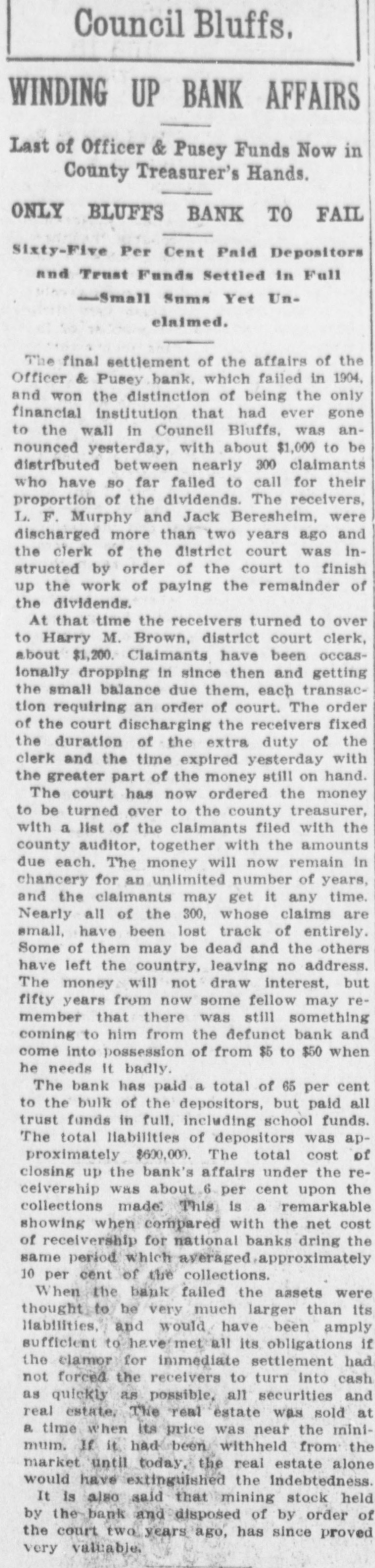 Council Bluffs. WINDING UP BANK AFFAIRS Last of Officer & Pusey Funds Now in County Treasurer's Hands. ONLY BLUFFS BANK TO FAIL Sixty-Five Per Cent Paid Depositors and Trust Funds Settled in Full -Small Sums Yet Unclaimed. The final settlement of the affairs of the Officer & Pusey bank, which failed in 1904, and won the distinction of being the only financial institution that had ever gone to the wall in Council Bluffs, was announced yesterday, with about $1,000 to be distributed between nearly 300 claimants who have so far failed to call for their proportion of the dividends. The receivers, L. F. Murphy and Jack Beresheim, were discharged more than two years ago and the clerk of the district court was instructed by order of the court to finish up the work of paying the remainder of the dividends. At that time the receivers turned to over to Harry M. Brown, district court clerk, about $1,200. Claimants have been occasIonally dropping in since then and getting the small balance due them, each transaction requiring an order of court. The order of the court discharging the receivers fixed the duration of the extra duty of the clerk and the time expired yesterday with the greater part of the money still on hand. The court has now ordered the money to be turned over to the county treasurer, with a list of the claimants filed with the county auditor, together with the amounts due each. The money will now remain in chancery for an unlimited number of years, and the claimants may get it any time. Nearly all of the 300, whose claims are small, have been lost track of entirely. Some of them may be dead and the others have left the country, leaving no address. The money will not draw interest, but fifty years from now some fellow may remember that there was still something coming to him from the defunct bank and come into possession of from $5 to $50 when he needs It badly. The bank has paid a total of 65 per cent to the bulk of the depositors, but paid all trust funds in full. including school funds. The total liabilities of depositors was approximately $600,000. The total cost of closing up the bank's affairs under the receivership was about 6 per cent upon the collections made: This is a remarkable showing when compared with the net cost of receivership for national banks dring the same period which averaged approximately 10 per cent of the collections. When the bank failed the assets were thought to be very much larger than its liabilities, and would have been amply sufficient to have met all its obligations if the clamor for immediate settlement had not forced the receivers to turn into cash as quickly as possible, all securities and real estate, The real estate was sold at a. time when its price was near the minimum. If it, had been withheld from the market until today the real estate alone would have extinguished the indebtedness It is also said that mining stock held by the bank and disposed of by order of the court two years ago, has since proved very valuable.