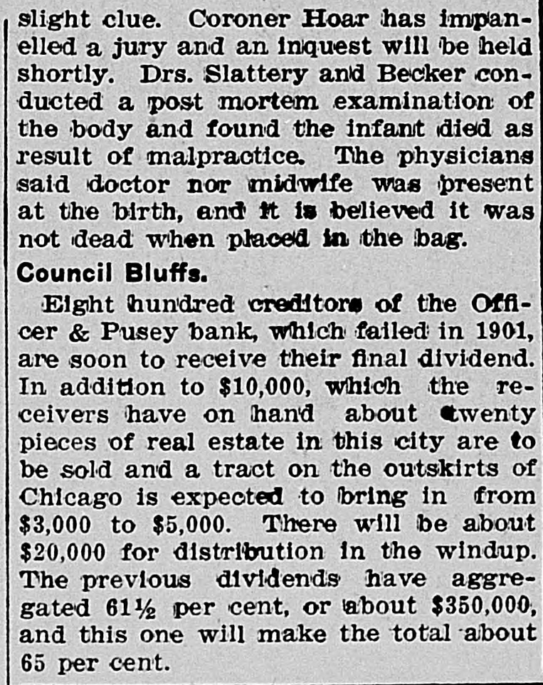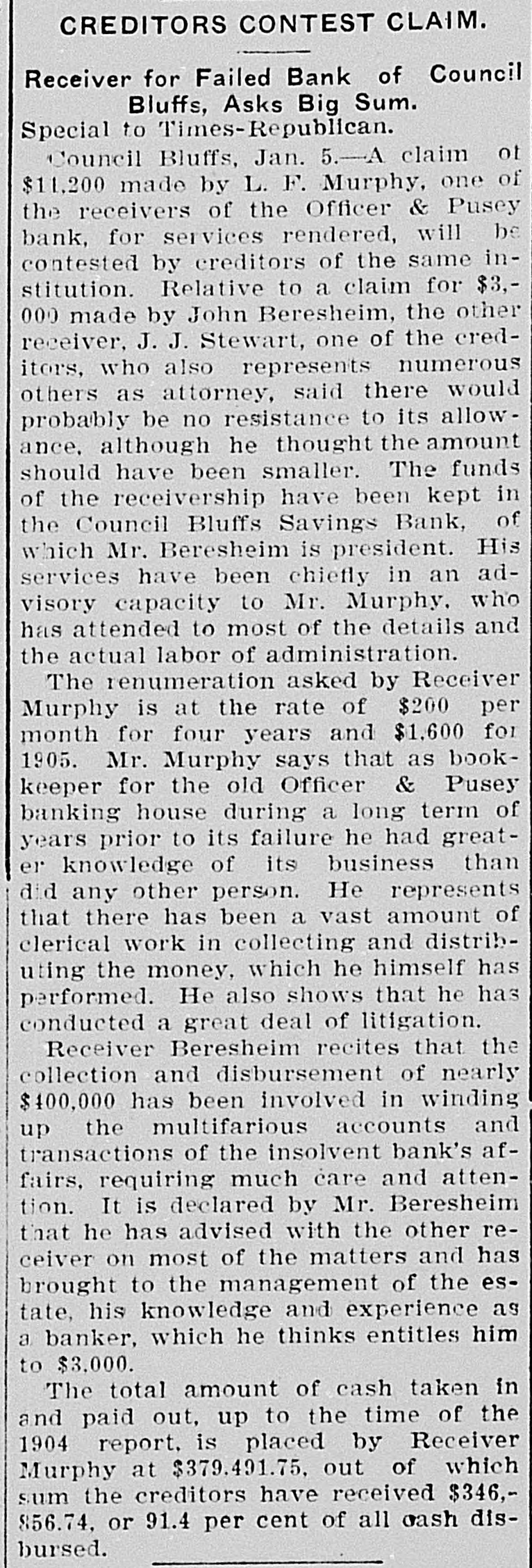 CREDITORS CONTEST CLAIM. Receiver for Failed Bank of Council Bluffs, Asks Big Sum. Special to Times-Republican Council Bluffs, Jan. 5.-A claim ot $11,200 made by L. F. Murphy, one of the receivers of the Officer & Pusey bank, for services rendered, will be contested by creditors of the same institution. Relative to a claim for $3,000 made by John Beresheim, the other receiver, J. J. Stewart, one of the creditors, who also represents numerous others as attorney, said there would probably be no resistance to its allow ance, although he thought the amount should have been smaller. The funds of the receivership have been kept in the Council Bluffs Savings Bank, of which Mr. Beresheim is president. His services have been chiefly in an advisory capacity to Mr. Murphy. who has attended to most of the details and the actual labor of administration. The renumeration asked by Receiver Murphy is at the rate of $200 per month for four years and $1,600 for 1905. Mr. Murphy says that as bookkeeper for the old Officer & Pusey banking house during a long term of years prior to its failure he had greater knowledge of its business than did any other person. He represents that there has been a vast amount of clerical work in collecting and distributing the money, which he himself has performed. He also shows that he has conducted a great deal of litigation. Receiver Beresheim recites that the collection and disbursement of nearly $400,000 has been involved in winding up the multifarious accounts and transactions of the insolvent bank's affairs, requiring much care and attention. It is declared by Mr. Beresheim that he has advised with the other receiver on most of the matters and has brought to the management of the estate, his knowledge and experience as a banker, which he thinks entitles him to $3,000. The total amount of cash taken in and paid out, up to the time of the 1904 report. is placed by Receiver Murphy at $379.491.75, out of which sum the creditors have received $346,856.74, or 91.4 per cent of all cash disbursed.