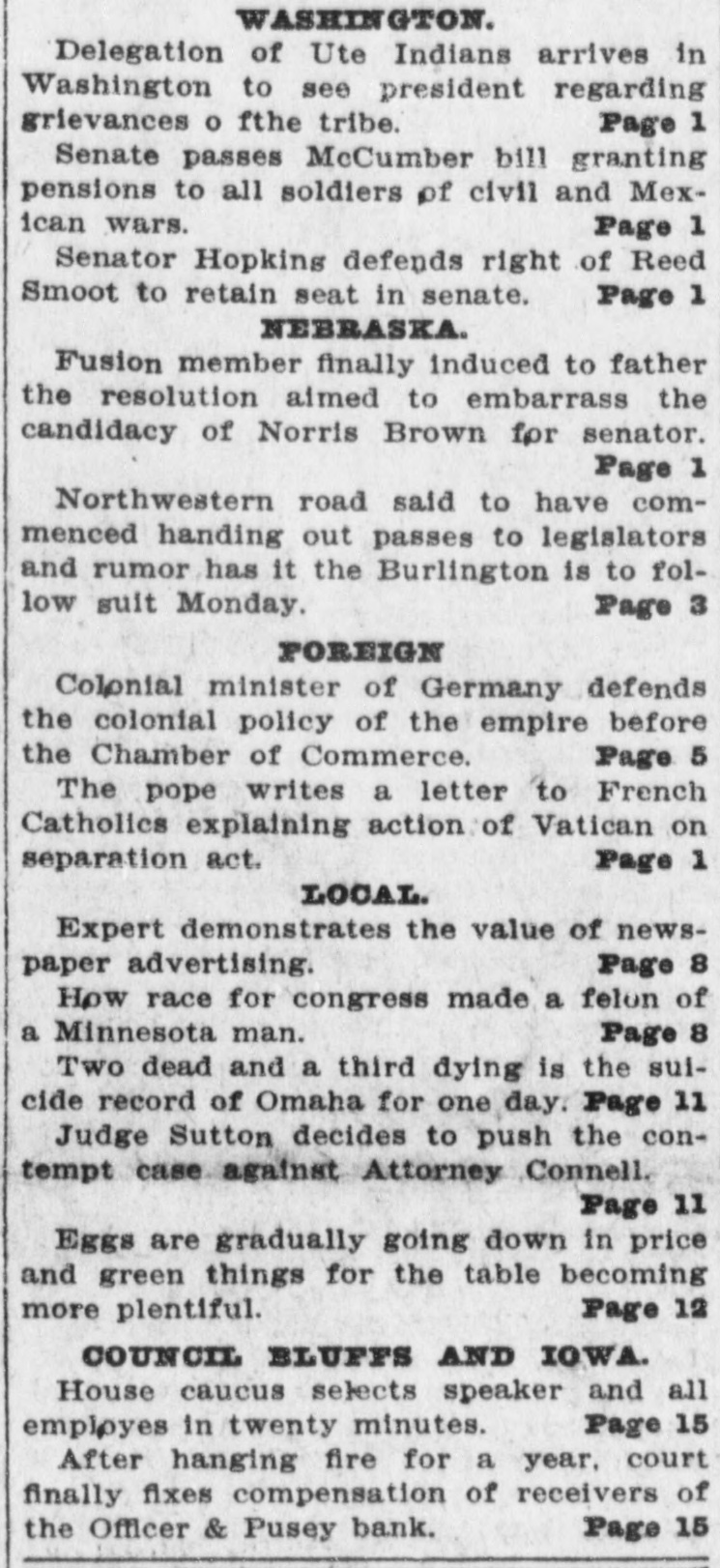 WASHING GTON. Delegation of Ute Indians arrives in Washington to see president regarding grievances o fthe tribe. Page 1 Senate passes McCumber bill granting pensions to all soldiers of civil and Mexican wars. Page 1 Senator Hopking defends right of Reed Smoot to retain seat in senate. Page 1 NEBRASKA. Fusion member finally induced to father the resolution aimed to embarrass the candidacy of Norris Brown for senator. Page 1 Northwestern road said to have commenced handing out passes to legislators and rumor has it the Burlington is to follow suit Monday. Page 3 FOREIGN Colonial minister of Germany defends the colonial policy of the empire before the Chamber of Commerce. Page 5 The pope writes a letter to French Catholics explaining action of Vatican on separation act. Page 1 LOCAL. Expert demonstrates the value of newspaper advertising. Page 8 How race for congress made a felon of a Minnesota man. Page 8 Two dead and a third dying is the suicide record of Omaha for one day. Page 11 Judge Sutton decides to push the contempt case against Attorney Connell. Page 11 Eggs are gradually going down in price and green things for the table becoming Page 12 more plentiful. COUNCIL BLUFFS AND IOWA. House caucus selects speaker and all Page 15 employes in twenty minutes. After hanging fire for a year. court finally fixes compensation of receivers of the Officer & Pusey bank. Page 15