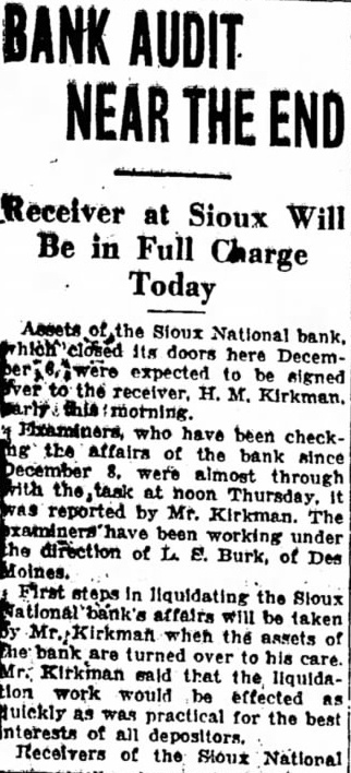 Appointment of receivers for the First National and Sioux National ... B. C. Schram ... has been named receiver for the First National and H. Marshall Kirkman ... has been placed in charge of the Sioux [Sloux] National bank.