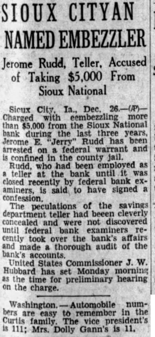 Jerome Rudd, Teller. Accused of Taking $5,000 From Sioux National