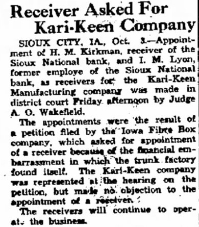 For Receiver Company SIOUX CITY. Oct. of the ment bank, Lyon, Sioux National the Sioux National former employe of receivers the bank, made in company afternoon by Judge district court Friday Wakefield. the result The appointments were Box petition filed by which asked for appointment the financial receiver because which trunk factory found itself. The Kari-Keen company hearing on the objection to the petition, but made appointment will continue to operreceivers the