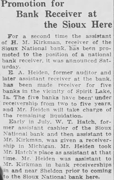 For second time the assistant of H. M. Kirkman, receiver of the Sioux National bank. has been promoted to the position of a national bank receiver, it was announced Saturday. E A. Heiden, former auditor and later assistant receiver at the bank. has been made receiver for five banks in the vicinity of Spirit Lake, Ia. The five banks have been' under receivership from two to five years, and Mr. Heiden will take charge of the Early in July, W. T. Hatch, former assistant cashier of the Sioux bank and then assistant to Mr. was given receivership in Michigan. Mr. Heiden took Mr. place as assistant at that time. Mr. Heiden was assistant to Mr. in bank receiverships in and near Sheldon prior to coming the Sioux National bank here.