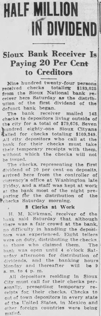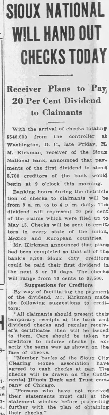 Banking hours during the distribue tion of checks to claimants will be from to to daily. The dividend will represent 20 per cent of the claims which were filed to May 15. Checks will be sent tors in every state of the union, Mexico and European countries Mr. Kirkman announced that plans had been completed so that the bank's 5,200 Sloux City creditors could be paid their first dividend in the next 10 days. The checks range from 10 cents to $7,500. Suggestions for Creditors By of facilitating the payment Kirkman made the following suggestions to crediclaimants should present their temporary receipts at the bank dividend checks and regular receivcertificates then will issued them. Care should be taken by creditors to indorse checks in actly same way as shown the face of checks. "Member banks of the Sioux City Clearing House association agreed cash checks par. The checks be drawn on the Continental Illinois Bank and Trust com. Chicago. "Persons who have not received their statements must statement window proceeding further with the plan of obtaining their checks."