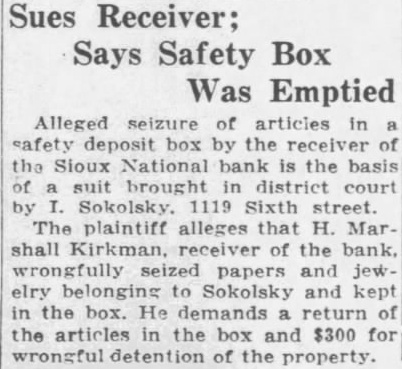 Was Emptied Alleged seizure of articles in the Sioux National bank is the of brought in district court by Sokolsky. 1119 Sixth street. The plaintiff alleges that H. Marshall Kirkman, receiver of the bank. wrongfully seized papers and jewelry belonging to Sokolsky and kept in the box. He demands return of the articles in the box and $300 for wrongful detention of the property.
