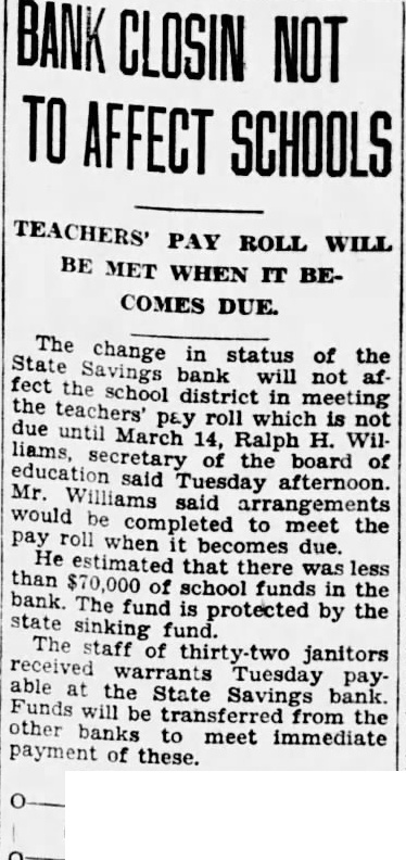BANK CLOSIN NOT AFFECT SCHOOLS TEACHERS' PAY ROLL WILL BE MET WHEN IT BECOMES DUE. The change in status of the State Savings bank will not affect the school district in meeting the teachers' pay roll which is not due until March 14, Ralph H. Williams, secretary of the board of education said Tuesday afternoon. Mr. Williams said arrangements would be completed to meet the pay roll when it becomes due. He estimated that there was less than $70,000 of school funds in the bank. state The fund is protected by the sinking The staff of thirty-two janitors received warrants Tuesday payable at the State Savings bank. Funds will be transferred from the other banks to meet immediate payment of these.