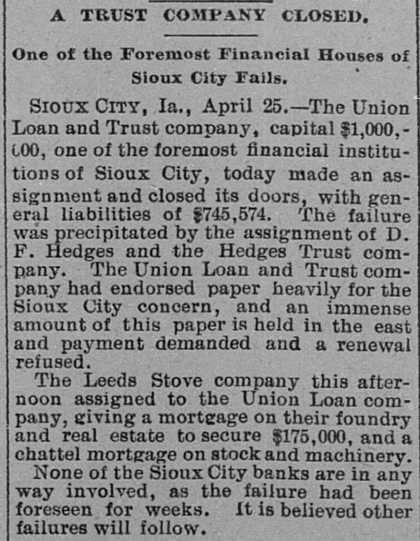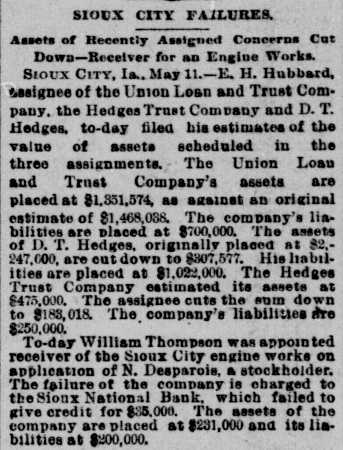 The insolvency of Mr. Hubbard is sa'd to be due to depreciation of stock of the National Linseed Oil company, of which he is a large shareholder. In 1888 Hubbard & Gere owned and operated the large oil mill at Sioux City, and turned that property over to the oil company for 11,000 shares of stock, then worth $33 per share. The decline in value of this stock began in 1892, and the panic of '93 reduced its value, so that today it is quoted at $10 a share. When Mr. Hubbard retired from the management of the company a few years ago the shares were worth $55. This shows a depreciation from $550,000 to $110,000. Mr. Hubbard drew heavily from the milling company to meet the demands made upon him on account of the shrinkage of these securities, which were held by Eastern banks as collateral. During the past four years Mr. Hubbard's properties have shrunk in value over $800,000. He has endeavored to settle with his creditors, but nothing succeeded, and was forced to the assignment of today.