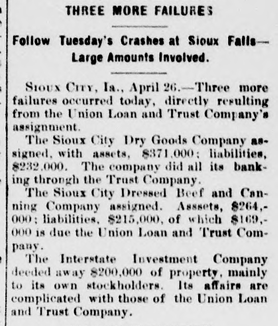 Mr. Hubbard has not yet given a definite estimate of assets and liabilities, but places the latter at half a million dollars. The assets will not exceed over two-thirds this amount. The schedule will be filed in a few days, and not until then will the details be known. The creditors are nearly all Eastern banking institutions. None of the local banks will be affected, and it is not thought this failure will embarass any other concern. Rumors have been aficat for some time, that the company was in a bad financial condition, and the failure does not come as a shock to Mankato.