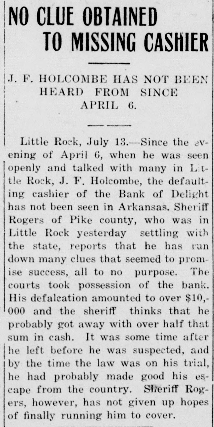 NO CLUE OBTAINED TO MISSING CASHIER J. F. HOLCOMBE HAS NOT BEEN HEARD FROM SINCE APRIL 6. Little Rock, July 13.-Since the evening of April 6, when he was seen openly and talked with many in Little Rock, J. F. Holcombe, the defaulting cashier of the Bank of Delight has not been seen in Arkansas. Sheriff Rogers of Pike county, who was in Little Rock yesterday settling with the state, reports that he has run down many clues that seemed to promise success, all to no purpose. The courts took possession of the bank. His defalcation amounted to over $10,000 and the sheriff thinks that he probably got away with over half that sum in cash. It was some time after he left before he was suspected, and by the time the law was on his trial, he had probably made good his escape from the country. Sheriff Rogers, however, has not given up hopes of finally running him to cover.