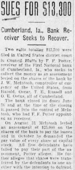 SUES FOR $13,300 Cumberland, la., Bank Receiver Seeks to Recover. Two suits totaling $13,300 were filed in United States district court in Council Bluffs by F F. Potter receiver of the First National bank of Cumberland, Ia., who seeks to collect the money as an assessment levied on the shares of the bank by J. W. Meintosh. of cur rency of the United States, from O E. Ostus, all of Cumberland The bank closed its doors June 30 and at the time of the closing IL passed into the control of MeIn tosh, who had F. F. Potter appointed as receiver On August 31 Mcintosh levied an assessment of $25,000 on the shares of the bank to pay the losses and in October he demanded the par value of every share of capital stock All five defendants have failed to pay their part of the a* sessment, Potter alleges He fur ther alleges that shares were trans ferred by the defendants to one an other with the intention to defraud