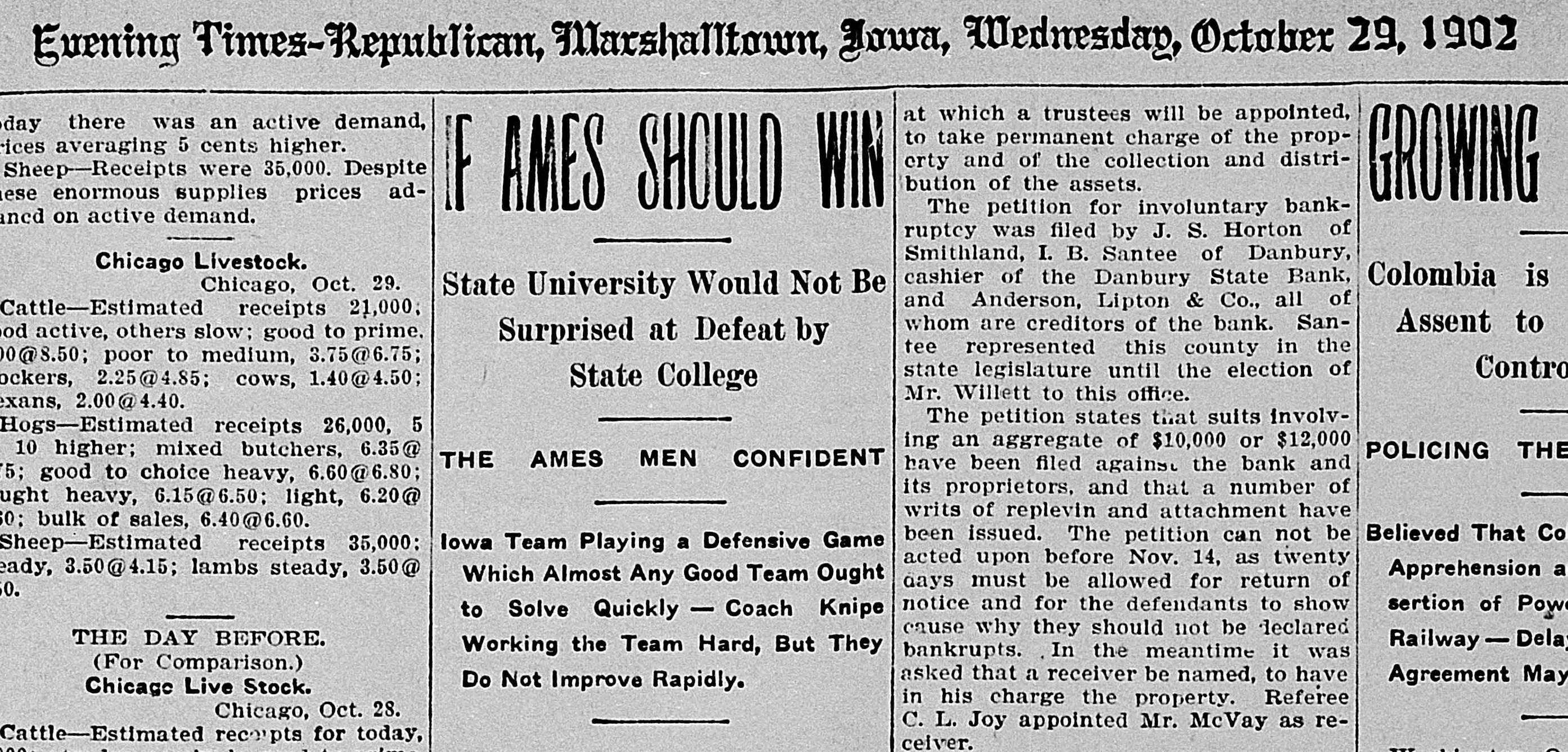 Evening Times-Republican, Marshalltown, Invary, Wednesday, October 29. 1902 at which a trustees will be appointed, day there was an active demand, to take permanent charge of the propices averaging 5 cents higher. crty and of the collection and distriSheep-Receipts were 35,000. Despite bution of the assets. GROWING lese enormous supplies prices adAMES SHOULD F The petition for involuntary bankned on active demand. ruptcy was filed by J. S. Horton of Smithland, I. B. Santee of Danbury, Chicago Livestock. Colombia is cashier of the Danbury State Bank, Chicago, Oct. 29. State University Would Not Be and Anderson, Lipton & Co., all of Cattle-Estimated receipts 21,000, whom are creditors of the bank. SanAssent to od active, others slow; good to prime. Surprised at Defeat by tee represented this county in the 0@8.50; poor to medium, 3.75 @6.75; Contro state legislature until the election of ockers, 2.25@4.85; cows, 1.40@4.50; State College Mr. Willett to this office. exans, 2.00@4.40. The petition states that suits involvHogs-Estimated receipts 26,000, 5 ing an aggregate of $10,000 or $12,000 10 higher; mixed butchers, 6.35@ POLICING THE THE AMES MEN CONFIDENT have been filed against the bank and 5; good to choice heavy, 6.60@6.80; its proprietors, and that a number of ught heavy, 6.15@6.50; light, 6.20@ writs of replevin and attachment have $0: bulk of sales, 6.40@6.60. Believed That Co been issued. The petition can not be Iowa Team Playing a Defensive Game Sheep-Estimated receipts 35,000: acted upon before Nov. 14, as twenty eady, 3.50@4.15; lambs steady, 3.50@ Apprehension a Which Almost Any Good Team Ought days must be allowed for return of 0. notice and for the defendants to show sertion of Pow to Solve Quickly - Coach Knipe cause why they should not be declared THE DAY BEFORE. Railway 1 Dela Working the Team Hard, But They bankrupts. . In the meantime it was (For Comparison.) asked that a receiver be named, to have Agreement May Do Not Improve Rapidly. Chicago Live Stock. in his charge the property. Referee Chicago, Oct. 28. C. L. Joy appointed Mr. McVay as reCattle-Estimated receipts for today, ceiver. A