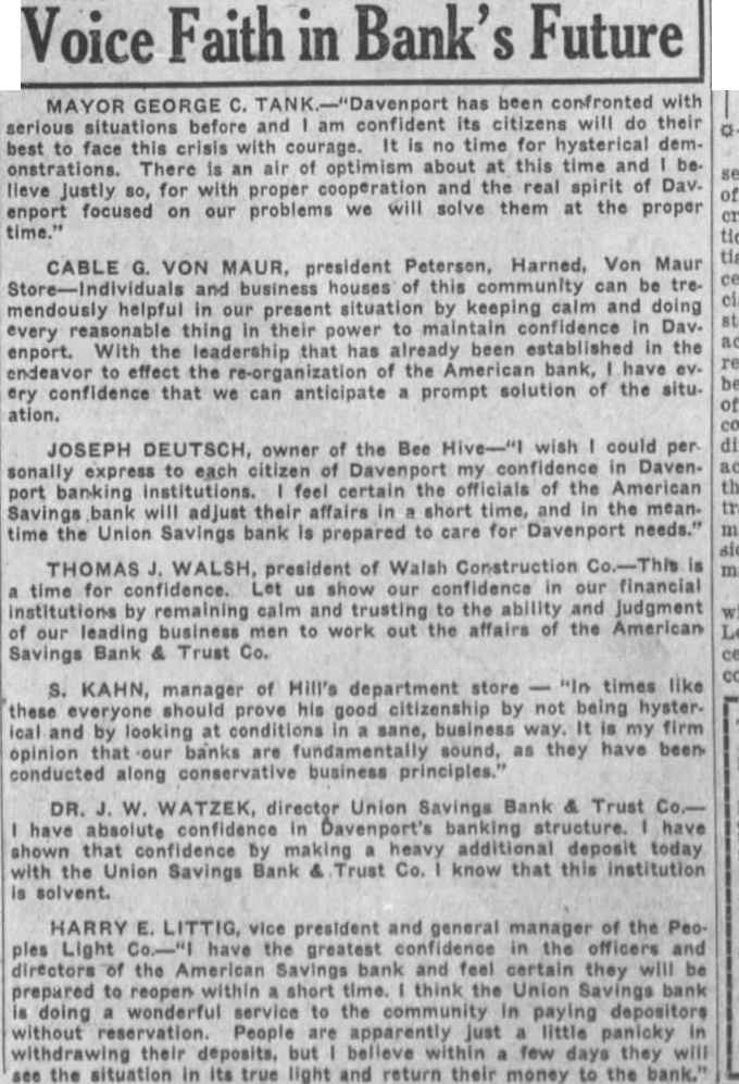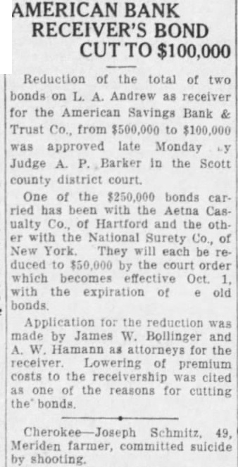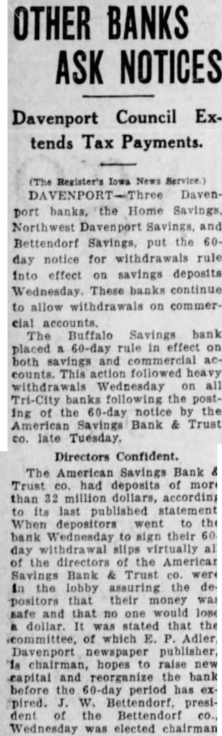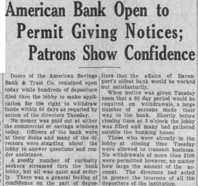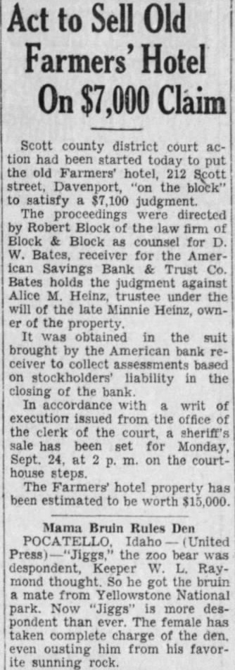 The American Savings Bank & Trust Co. receivership in Davenport repaid to the Reconstruction Finance Corp. 405 of its loan during the last eight months, according to D. Thompson, examiner in active charge for A. Andrew, state superintendent of banking Accordingly, only $760,000 remains to be paid on the obligation. the has proved to be "going concern,' making net profit of during its for the benefit of depositors and other general creditors. An accounting is filed every three months in Scott county district court by the receiver, the next to be made as of March 31. These reports available at any time. Steady Repayment Since last June, the receiver has averaged $125,000 month in its payments to the Reconstruction Finance Corp. through the orderly liquidation assets and collection of stock assessments. The regular reports indicate rapid progress toward the point when money will become available for the fund from which dividends will be declared for depositors and other debenture bond holders. The net profit of represents income on assets after payment of taxes, repairs, upkeep and all expenses including court costs, attorney fees and employment of field men. These receipts are derived from such sources as interest on commercial loans, mortgages bonds, and the rentals of city and farm properties City real estate of $1,121,325 held the receivership consists of 130 properties, including the Lane building at the southeast corner of Third and Main streets, but not the building occupied by the Davenport Bank & Trust Co. This building is also owned by the receivership with a book value of $2,300,374.01.