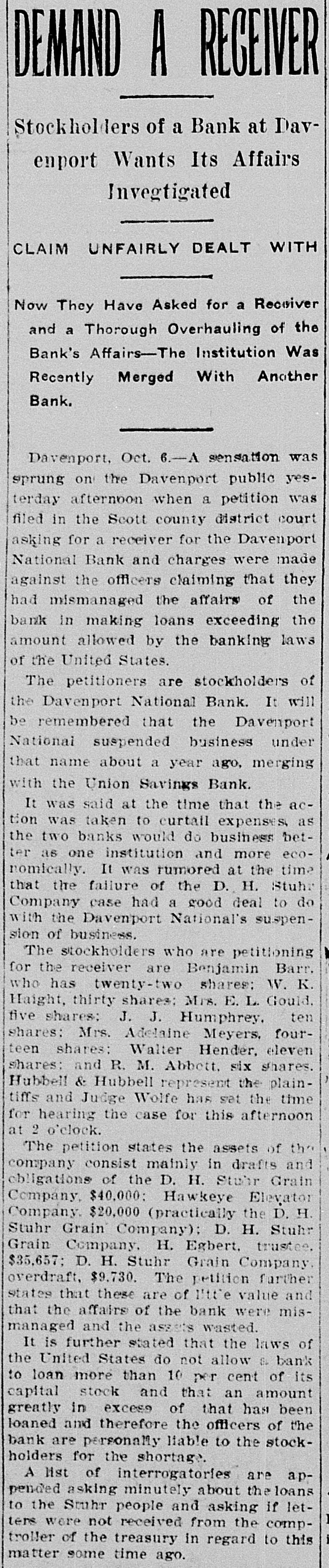 DEMAND A RECEIVER Stockholders of a Bank at Davenport Wants Its Affairs Invegtigated CLAIM UNFAIRLY DEALT WITH Now They Have Asked for a Receiver and a Thorough Overhauling of the Bank's Affairs-The Institution Was Recently Merged With Another Bank. Davenport, Oct. 6.-A sensation was sprung on the Davenport public yesterday afternoon when a petition was filed in the Scott county district court asking for a receiver for the Davenport National Bank and charges were made against the officers claiming that they had mismanaged the affairs of the bank in making loans exceeding the amount allowed by the banking laws of the United States. The petitioners are stockholders of the Davenport National Bank. It will be remembered that the Davenport National suspended business under that name about a year ago, merging with the Union Savings Bank. It was said at the time that the action was taken to curtail expenses as the two banks would do business better as one institution and more economically. It was rumored at the time that the failure of the D. H. Stuhr Company case had a good deal to do with the Davenport National's suspension of business. The stockholders who are petitioning for the receiver are Benjamin Barr. who has twenty-two shares: W. K. Haight, thirty shares: Mrs. E. L. Gould. five shares: J. J. Humphrey. ten shares: Mrs. Adelaine Meyers, fourteen shares: Walter Hender, eleven shares: and R. M. Abbett, six shares. Hubbell & Hubbell represent the plaintiffs and Judge Wolfe has sat the time for hearing the case for this afternoon at 2 o'clock. The petition states the assets of the company consist mainly in drafts and obligations of the D. H. Stuhr Grain Company, $40,000: Hawkeye Elevator Company. $20,000 (practically the D. H. Stuhr Grain Company): D. H. Stuhr Grain Company, H. Egbert. trustee. $35,657; D. H. Stuhr Grain Company. overdraft, $9.730. The petition further states that these are of l'tt'e value and that the affairs of the bank were mismanaged and the assets wasted. It is further stated that the laws of the United States do not allow & bank to loan more than 10 per cent of its capital stock and that an amount greatly in excess of that has been loaned and therefore the officers of the bank are personally liable to the stockholders for the shortage. A list of interrogatories are appended asking minutely about the loans to the Stuhr people and asking if letters were not received from the compi troller of the treasury in regard to this matter some time ago.