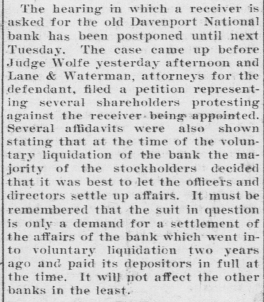 The hearing in which a receiver is asked for the old Davenport National bank has been postponed until next Tuesday. The case came up before Judge Wolfe yesterday afternoon and Lane & Waterman, attorneys for the defendant, filed a petition representing several shareholders protesting against the receiver being appointed. Several affidavits were also shown stating that at the time of the voluntary liquidation of the bank the majority of the stockholders decided that it was best to let the officers and directors settle up affairs. It must be remembered that the suit in question is only a demand for a settlement of the affairs of the bank which went into voluntary liquidation two years ago and paid its depositors in full at the time. It will not affect the other banks in the least.