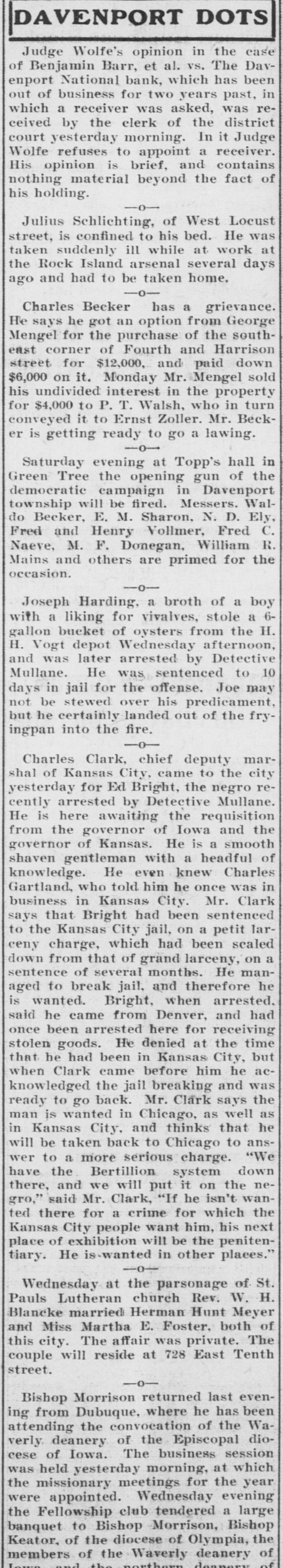 Judge Wolfe's opinion in the case of Benjamin Barr, et al. vs. The Davenport National bank, which has been out of business for two years past, in which a receiver was asked, was received by the clerk of the district court yesterday morning. In it Judge Wolfe refuses to appoint a receiver. His opinion is brief, and contains nothing material beyond the fact of his holding. Julius Schlichting, of West Locust street, is confined to his bed. He was taken suddenly ill while at work at the Rock Island arsenal several days ago and had to be taken home. Charles Becker has a grievance. He says he got an option from George Mengel for the purchase of the southeast corner of Fourth and Harrison street for $12,000, and paid down $6,000 on it. Monday Mr. Mengel sold his undivided interest in the property for $4,000 to P. T. Walsh, who in turn conveyed it to Ernst Zoller. Mr. Becker is getting ready to go a lawing. Saturday evening at Topp's hall in Green Tree the opening gun of the democratic campaign in Davenport township will be fired. Messers. Waldo Becker, E. M. Sharon, N. D. Ely, Fred and Henry Vollmer, Fred C. Naeve, M. F. Donegan, William R. Mains and others are primed for the occasion. Joseph Harding, a broth of a boy with a liking for vivalves, stole a 6gallon bucket of oysters from the H. H. Vogt depot Wednesday afternoon, and was later arrested by Detective Mullane. He was sentenced to 10 days in jail for the offense. Joe may not be stewed over his predicament, but he certainly landed out of the fryingpan into the fire. Charles Clark, chief deputy marshal of Kansas City, came to the city yesterday for Ed Bright, the negro recently arrested by Detective Mullane. He is here awaiting the requisition from the governor of Iowa and the governor of Kansas. He is a smooth shaven gentleman with a headful of knowledge. He even knew Charles Gartland, who told him he once was in business in Kansas City. Mr. Clark says that Bright had been sentenced to the Kansas City jail, on a petit larceny charge, which had been scaled down from that of grand larceny, on a sentence of several months. He managed to break jail, and therefore he is wanted. Bright, when arrested. said he came from Denver, and had once been arrested here for receiving stolen goods. He denied at the time that he had been in Kansas City, but when Clark came before him he acknowledged the jail breaking and was ready to go back. Mr. Clark says the man is wanted in Chicago, as well as in Kansas City, and thinks that he will be taken back to Chicago to answer to a more serious charge. "We have the Bertillion system down there, and we will put it on the negro," said Mr. Clark, "If he isn't wanted there for a crime for which the Kansas City people want him, his next place of exhibition will be the penitentiary. He is-wanted in other places." Wednesday at the parsonage of St. Pauls Lutheran church Rev. W. H. Blancke married Herman Hunt Meyer and Miss Martha E. Foster. both of this city. The affair was private. The couple will reside at 728 East Tenth street.