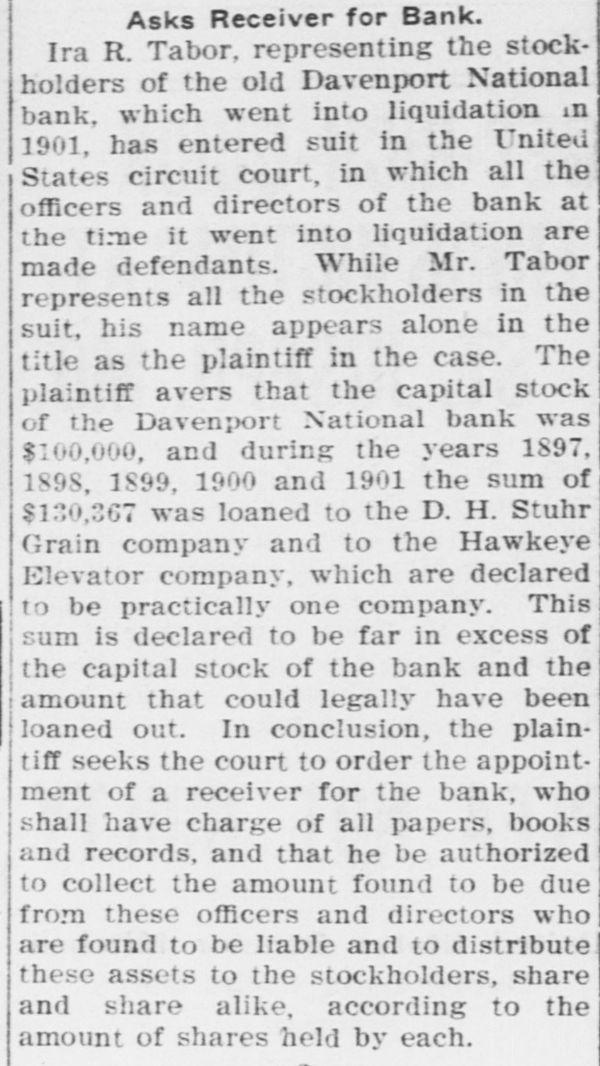 Asks Receiver for Bank. Ira R. Tabor, representing the stockholders of the old Davenport National bank, which went into liquidation in 1901, has entered suit in the United States circuit court, in which all the officers and directors of the bank at the time it went into liquidation are made defendants. While Mr. Tabor represents all the stockholders in the suit, his name appears alone in the title as the plaintiff in the case. The plaintiff avers that the capital stock of the Davenport National bank was $100,000, and during the years 1897, 1898, 1899, 1900 and 1901 the sum of $130,367 was loaned to the D. H. Stuhr Grain company and to the Hawkeye Elevator company, which are declared to be practically one company. This sum is declared to be far in excess of the capital stock of the bank and the amount that could legally have been loaned out. In conclusion, the plaintiff seeks the court to order the appointment of a receiver for the bank, who shall have charge of all papers, books and records, and that he be authorized to collect the amount found to be due from these officers and directors who are found to be liable and to distribute these assets to the stockholders, share and share alike, according to the amount of shares held by each.