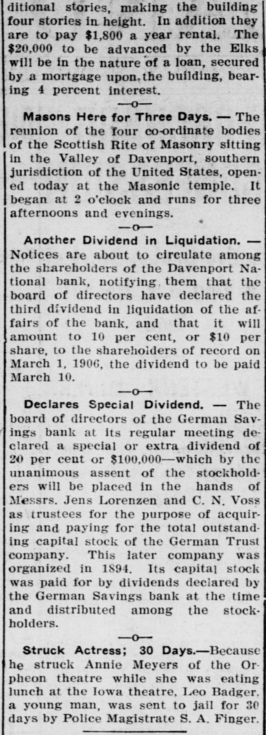 ditional stories, making the building four stories in height. In addition they are to pay $1,800 a year rental. The $20,000 to be advanced by the Elks will be in the nature of a loan, secured by a mortgage upon, the building, bearing 4 percent interest. Masons Here for Three Days. - The reunion of the four co-ordinate bodies of the Scottish Rite of Masonry sitting in the Valley of Davenport, southern jurisdiction of the United States, opened today at the Masonic temple. It began at 2 o'clock and runs for three afternoons and evenings. Another Dividend in Liquidation. Notices are about to circulate among the shareholders of the Davenport National bank, notifying, them that the board of directors have declared the third dividend in liquidation of the affairs of the bank, and that it will amount to 10 per cent, or $10 per share, to the shareholders of record on March 1, 1906, the dividend to be paid March 10. Declares Special Dividend. - The board of directors of the German Savings bank at its regular meeting declared a special or extra dividend of 20 per cent or $100,000-which by the unanimous assent of the stockholders will be placed in the hands of Messrs. Jens Lorenzen and C. N. Voss as trustees for the purpose of acquiring and paying for the total outstanding capital stock of the German Trust company. This later company was organized in 1894. Its capital stock was paid for by dividends declared by the German Savings bank at the time and distributed among the stockholders. Struck Actress; 30 Days.-Because he struck Annie Meyers of the Orpheon theatre while she was eating lunch at the Iowa theatre, Leo Badger, a young man, was sent to jail for 30 days by Police Magistrate S. A. Finger.