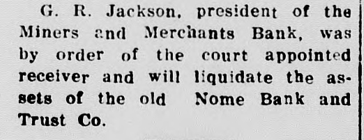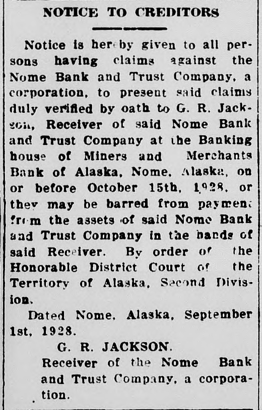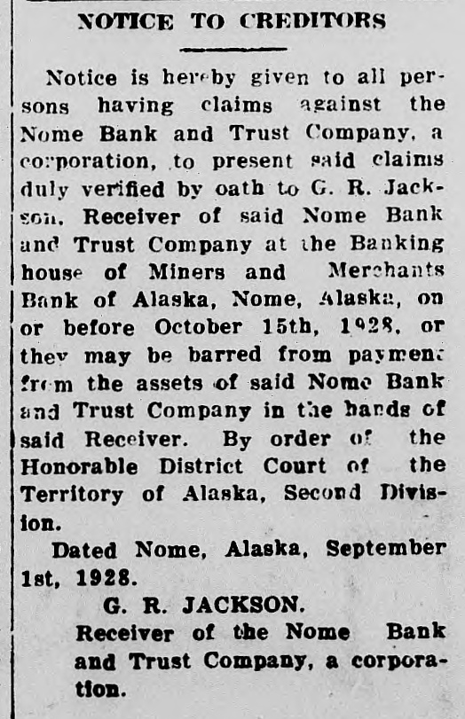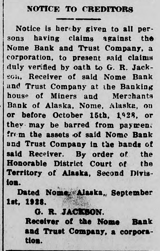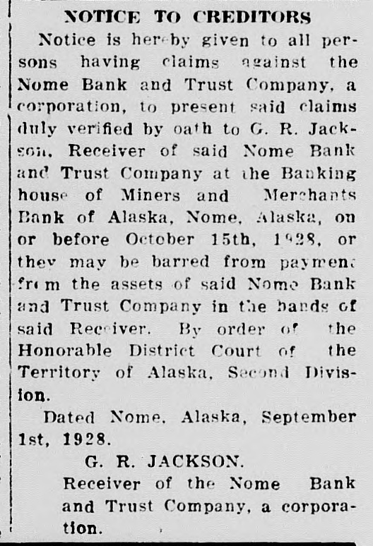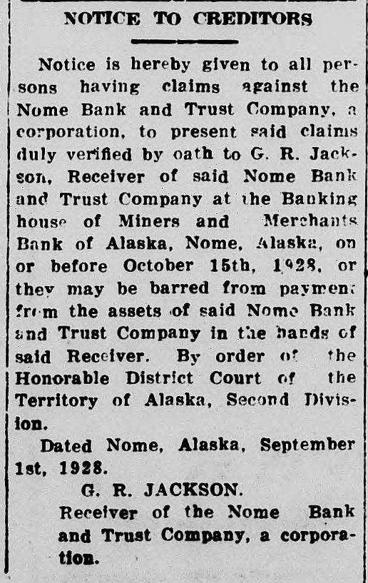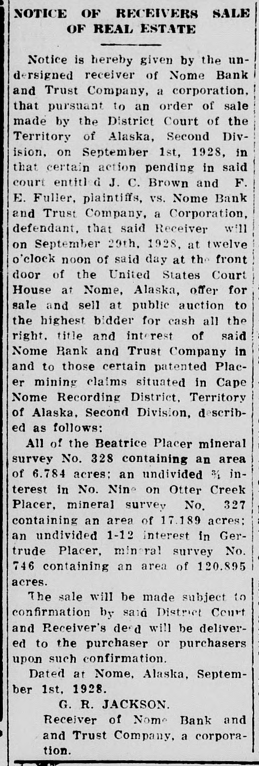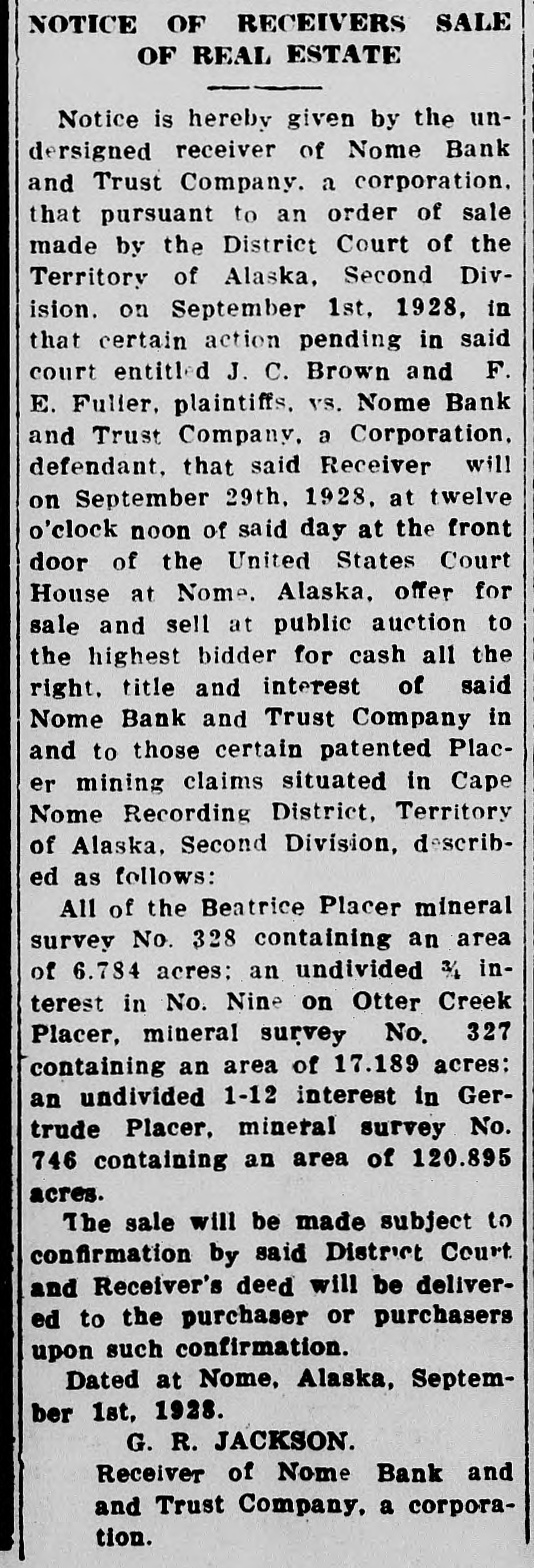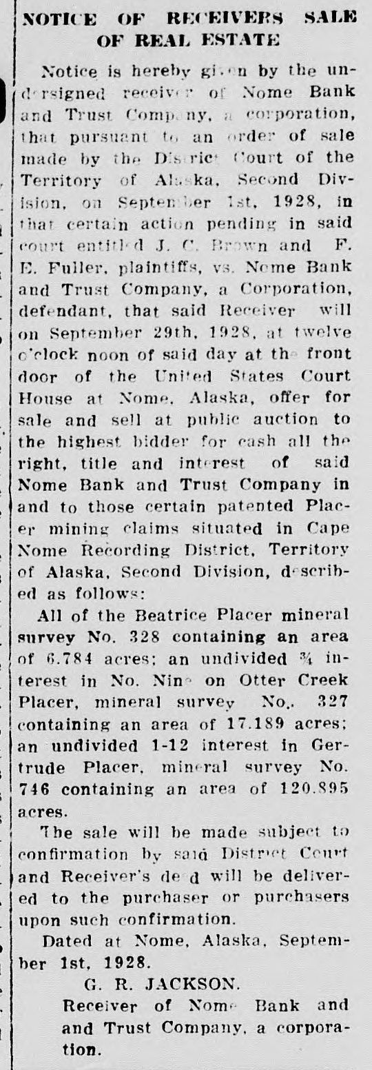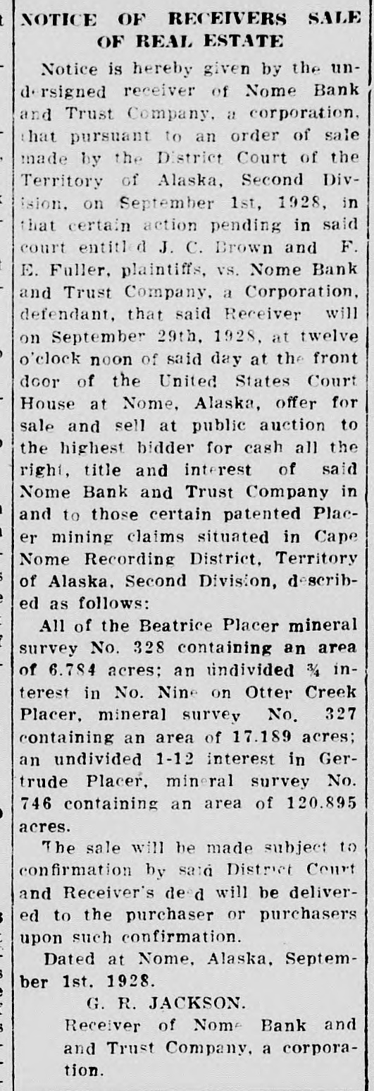 NOTICE OF RECEIVERS SALE OF REAL ESTATE Notice is hereby given by the undersigned receiver of Nome Bank and Trust Company, a corporation, that pursuant to an order of sale made by the District Court of the Territory of Alaska, Second Division, on September 1st, 1928, in that certain action pending in said court entitl d J. C. Brown and F. E. Fuller, plaintiffs, vs. Nome Bank and Trust Company, a Corporation, defendant, that said Receiver will on September 29th. 1928, at twelve o'clock noon of said day at th front door of the United States Court House at Nome, Alaska, offer for sale and sell at public auction to the highest bidder for cash all the right. title and interest of said Nome Rank and Trust Company in and to those certain patented Placer mining claims situated in Cape Nome Recording District, Territory of Alaska, Second Division, described as follows: All of the Beatrice Placer mineral survey No. 328 containing an area of 6.784 acres: an undivided 3/1 interest in No. Nine on Otter Creek Placer, mineral survey No. 327 containing an area of 17.189 acres: an undivided 1-12 interest in Gertrude Placer, mineral survey No. 746 containing an area of 120.895 acres. The sale will be made subject to confirmation by said District Court and Receiver's deed will be delivered to the purchaser or purchasers upon such confirmation. Dated at Nome, Alaska, September 1st, 1928. G. R. JACKSON. Receiver of Nome Bank and and Trust Company, a corporation.