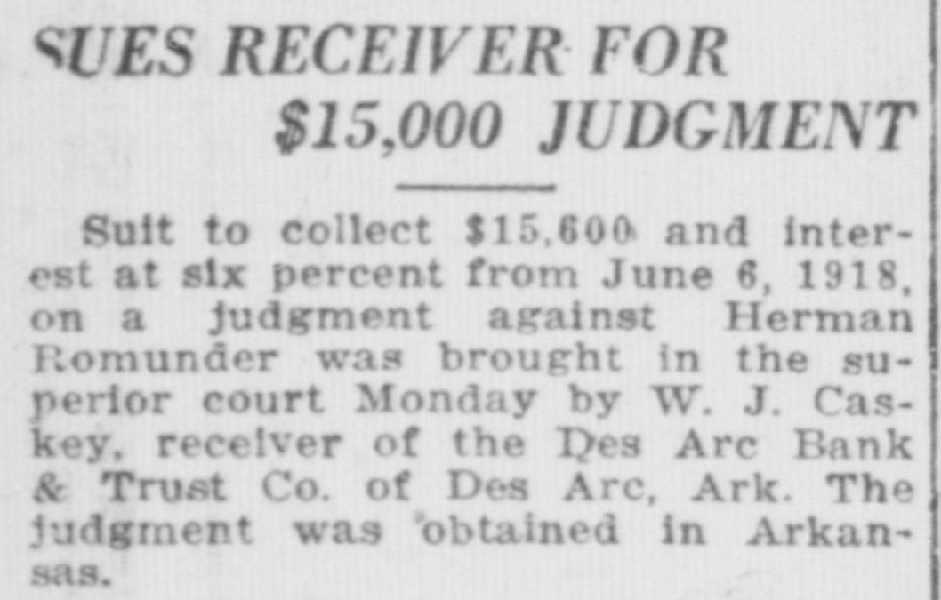 # SUES RECEIVER FOR # $15,000 JUDGMENT Suit to collect $15,600 and interest at six percent from June 6, 1918, on a judgment against Herman Romunder was brought in the superior court Monday by W. J. Caskey, receiver of the Des Arc Bank & Trust Co. of Des Arc, Ark. The judgment was obtained in Arkansas.