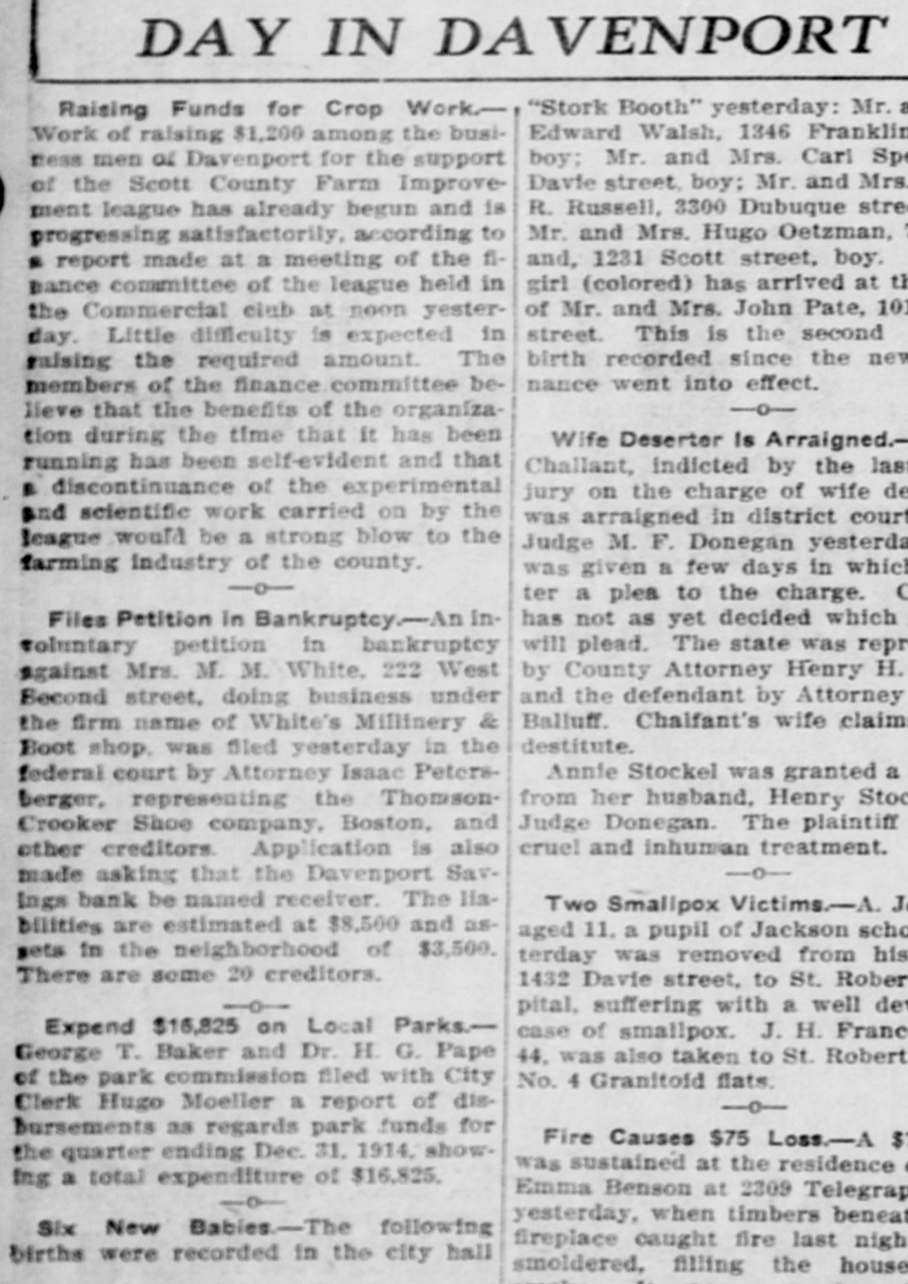 DAY IN DA VENPORT "Stork Booth" yesterday: Mr. a Raising Funds for Crop Work.Edward Walsh, 1346 Franklin Work of raising $1,200 among the busiboy; Mr. and Mrs. Carl Sp ness men of Davenport for the support Davie street, boy; Mr. and Mrs. of the Scott County Farm ImproveR. Russell, 3300 Dubuque stre ment league has already begun and is Mr. and Mrs. Hugo Oetzman, : progressing satisfactorily, according to and, 1231 Scott street, boy. . report made at a meeting of the flgirl (colored) has arrived at the Bance committee of the league held in of Mr. and Mrs. John Pate, 101 the Commercial club at noon yesterstreet. This is the second day. Little difficulty is expected in birth recorded since the new raising the required amount. The nance went into effect. members of the finance committee believe that the benefits of the organization during the time that it has been Wife Deserter Is Arraigned.running has been self-evident and that Challant, indicted by the las B. discontinuance of the experimental jury on the charge of wife de and scientific work carried on by the was arraigned in district court league would be a strong blow to the Judge M. F. Donegan yesterda farming Industry of the county. was given a few days in which ter a plea to the charge. C has not as yet decided which Files Petition in Bankruptcy.-An inwill plead. The state was repr soluntary petition in bankruptcy by County Attorney Henry H. against Mrs. M. M. White. 222 West and the defendant by Attorney Becond street, doing business under Balluff. Chalfant's wife claim the firm name of White's Millinery & destitute. Boot shop. was filed yesterday in the Annie Stockel was granted a federal court by Attorney Isaac Petersberger, representing the Thomsonfrom her husband, Henry Stoc Judge Donegan. The plaintiff Crooker Shoe company, Boston, and cruel and inhuman treatment. other creditors. Application is also -0made asking that the Davenport SavIngs bank be named receiver. The liaTwo Smallpox Victims.-A. J bilities are estimated at $8,500 and asaged 11. a pupil of Jackson scho gets in the neighborhood of $3,500. terday was removed from his There are some 20 creditors. 1432 Davie street, to St. Rober -0pital, suffering with a well de Expend $16,825 on Local Parks.case of smallpox. J. H. Franc George T. Baker and Dr. H. G. Pape 44, was also taken to St. Robert of the park commission filed with City No. 4 Granitoid flats. Clerk Hugo Moeller a report of dis-0bursements as regards park funds for Fire Causes $75 Loss.-A $ the quarter ending Dec. 31, 1914, showwas sustained at the residence Ing a total expenditure of $16,825. Emma Benson at 2309 Telegrap yesterday, when timbers beneat Six New Bables-The following fireplace caught fire last nigh births were recorded in the city hall smoldered, filling the house