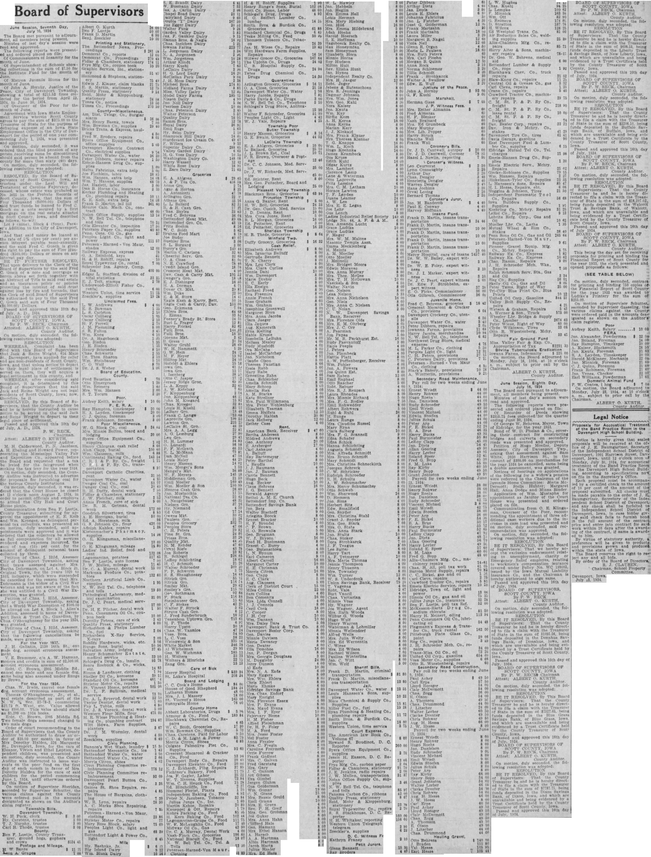 Albert Kurth Luetje Frank Martin Benj. Zoeckler Printing and Stationery, The Democrat reports Democrat Co., Proceedings Frye Co., book Inc., & Stephens, stationery Klauer, claim blanks notice Proceedings Am. Telegr. Co., Beenk, towels supplies & Express, repairs Equipment Co., Contract Co., water repairs Hansen Drug supextra help extra supplies Dan Heating consupplies Peterson Paper supplies Light Co., and power Petersen Harned Von shades Express, express Ins. Agency. Comp Edgar Stafford. division of Fisher Co., rental Western Union time service Unclaimed Fees. Bowman Carleton Collberg Collberg Ferrell Flemming Fulton Hageboeck Risden Risden Schroeder Schwartz Sharon Steinbauer Dr. Weber Board Education County. Fred Baustian $ Elmergreen Reimers Hansen Yocum Poor. Audrey Ray Hampton timekeeper timekeeper Quinn, foreman foreman Poor Miscellaneous. Block Mrs Minnie Bolton. board and Byers Equipment Co., cash relief food freight transDavenport Catholic Charities, Water Co., water coal dental Chambers, Fletcher, Getman, dental tires Klingaman, miscellaneand potatoes auto license dental work Produce Co., potaArtificial Limb Co., Tel. Co., telephone Laboratory, medDr C. Peart. medical serv-