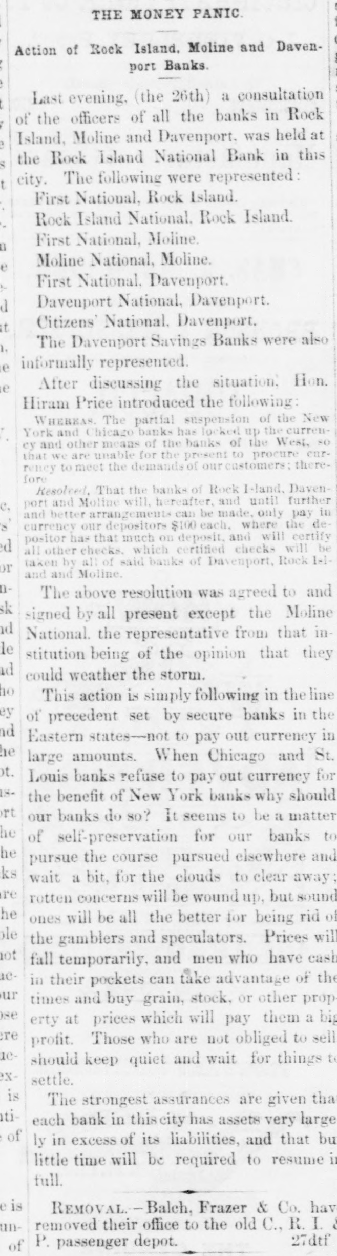 THE MONEY PANIC Action of Rock Island, Moline and Daven$ port Banks. Last evening, (the 26th) a consultation of the officers of all the banks in Rock Island, Moline and Davenport. was held at the Rock Island National Bank in this city. The following were represented First National, Rock Island. Rock Island National. Rock Island. First National, Moline. 0 Moline National, Moline. e First National, Davenport. . Davenport National, Davenport. d Citizens National. Davenport. t The Davenport Savings Banks were also 1. informally represented. e After discussing the situation. Hon. e Hiram Price introduced the following: WHEREAS The partial suspension of the New York and Chicago banks has locked up the currency and other means of the banks of the West. so that we are unable for the present to procure currency to meet the demands of our customers; therefore Resolved. That the banks of Rock I-land, Davenport and Moline will, hereafter. and until further e. and better arrangements can be made, only pay in S currency our depositors $100 each. where the depositor has that much on deposit. and will certify d all other checks. which certified checks will be taken by all of said banks of Davenport, Rock 1-1or and and Moline. n The above resolution was agreed to and sk signed by all present except the Moline d National. the representative from that inle stitution being of the opinion that they d could weather the storm. no This action is simply following in the line ey of precedent set by secure banks in the nd Eastern states-not to pay out currency in he large amounts. When Chicago and St. ot. Louis banks refuse to pay out currency for the benefit of New York banks why should rt our banks do so? It seems to be a matter he of self-preservation for our banks to he pursue the course pursued elsewhere and ks wait a bit, for the clouds to clear away re rotten concerns will be wound up, but sound he ones will be all the better for being rid of ple the gamblers and speculators. Prices will not fall temporarily, and men who have cash acin their pockets can take advantage of the ur times and buy grain, stock. or other prop se erty at prices which will pay them a big re profit. Those who are not obliged to sell 10should keep quiet and wait for things to ex settle. is The strongest assurances are given tha ti each bank in this city has assets very large of ly in excess of its liabilities, and that bu little time will be required to resume i full. e is REMOVAL.- - Balch, Frazer & Co. hav removed their office to the old C., R. I. & un27dtf P. passenger depot. of