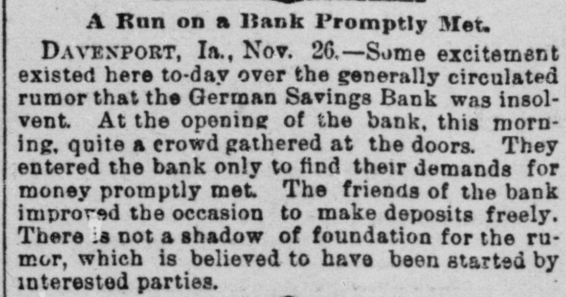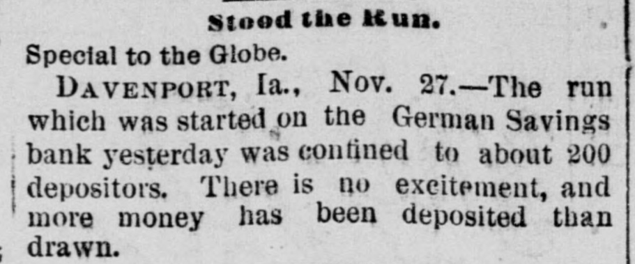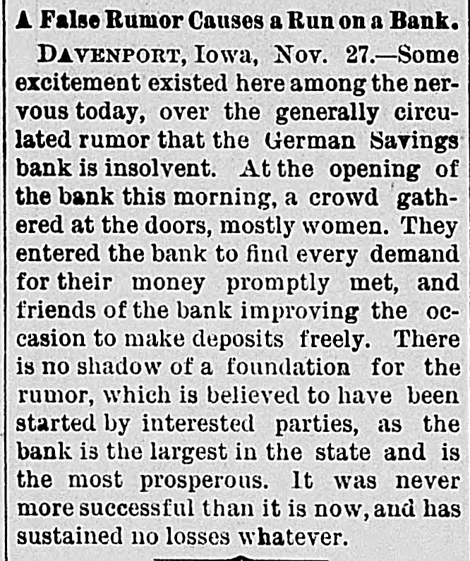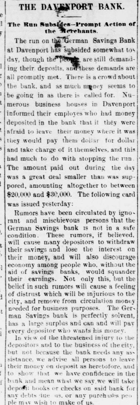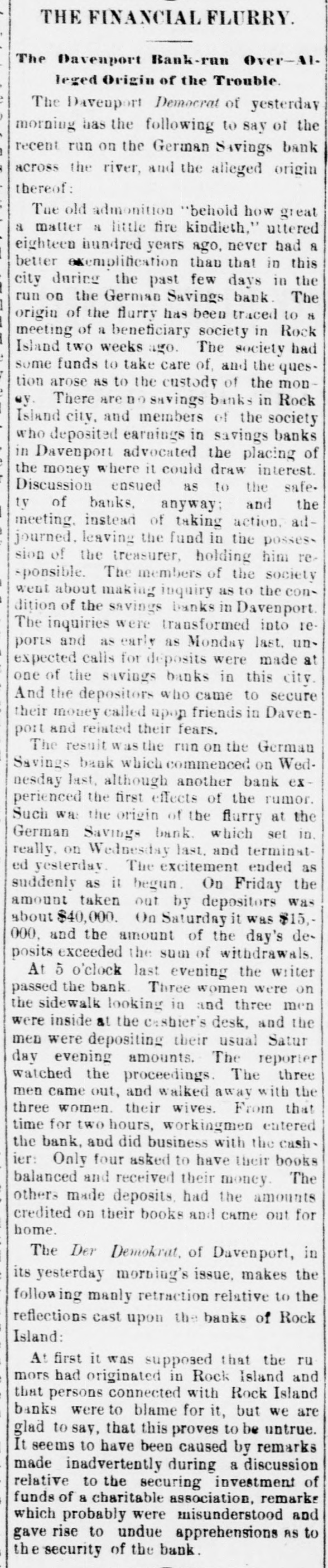 A SENSATIONAL REPORT. Rumors of a Bank Suspending in Davenport Said to have Originated in Rock Island. Manv wild and exciting rumors were afloat here, and in Davenport yesterday, concerning the alledged embarrassment and suspension of the well known Gers man savings bank at Davenport. Excitement became intense as the rumors spread, and much anxiety was expressed by those having deposits, in the institus tion, and business men generally. The reports were to the effect that for two weeks back there had been an unusual run on the bank, and that some of the heaviest depositors had withdrawn their funds, and placed them elsewhere. Others, it was stated, had de manded their money and the bank had been unable to meet them. On the day before Thanks giving $600 had been taken out by depositors on this side of the river alone. The Davenport daily Der Democrat. the German paper printed at Davenport, and the proprietor of which is president of the bank in question contained an extended article on the matter yesterday morning in which it was stated that the rumors were without the least foundation, and had their origin in the banks of Rock Island, the officers of which had used this method of preventing Rock Island people from depositing their money in the vaults of Davenport banks. Last evening President Lischer, of the German savings bank was interviewed. and he stated that, while the rumors had occasioned a little uneasiness among depositors and the withdrawing of some of the deposits, claimed that the bank had never been in in more prosperous condition than now, and was ready to meet any demands that might come upon it, no matter how urgent The German savings bank at Daven port has always been regarded as one of the soundest in the state of Iowa. Its directors are all successful business men, and careful financiers. and while these unfounded rumors will naturally prove in 8 measure detrimental to the bank, they will in no way cause it to shake. From the fact that the banks of Rock Island pay no interest on deposits, and the Davenport banks pay a rate of four and five per cent, it is not surprising that a great deal of the money of this city finds its way into the safekeeping of the banking houses across the river where a gain is realized by 80 doing.
