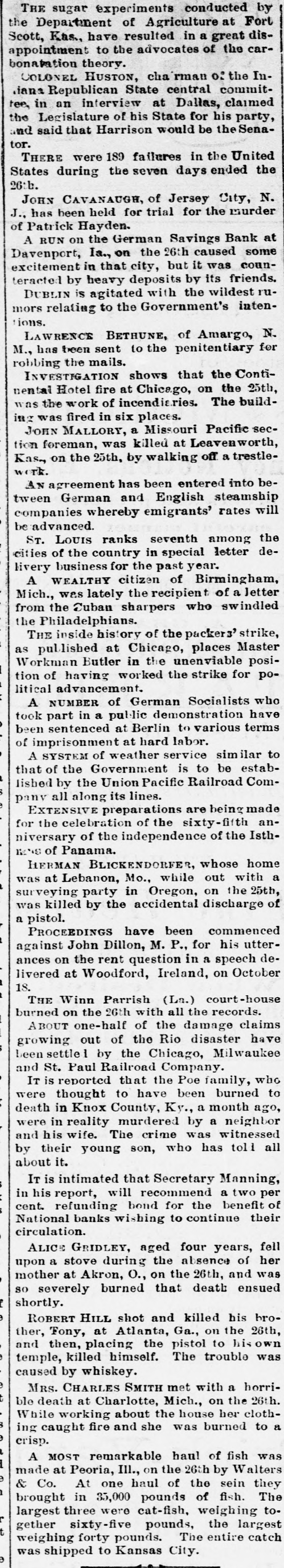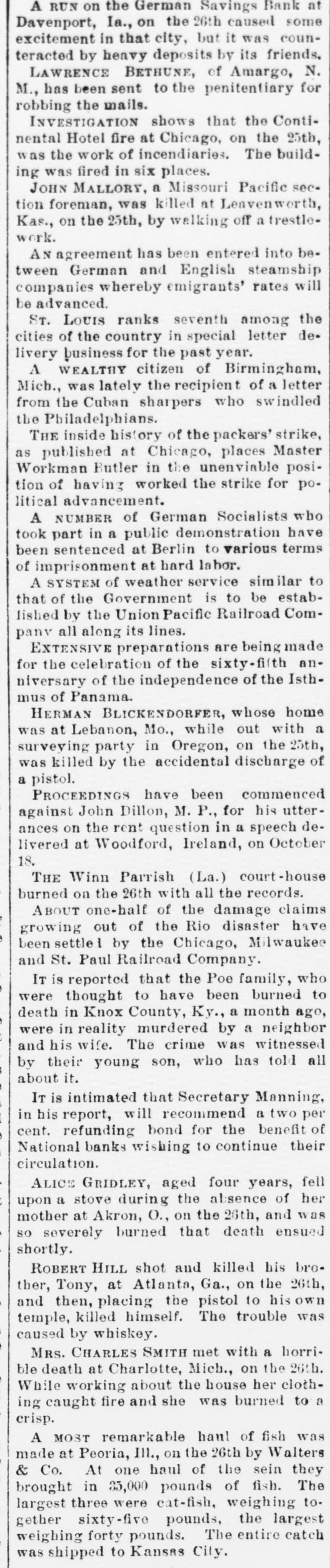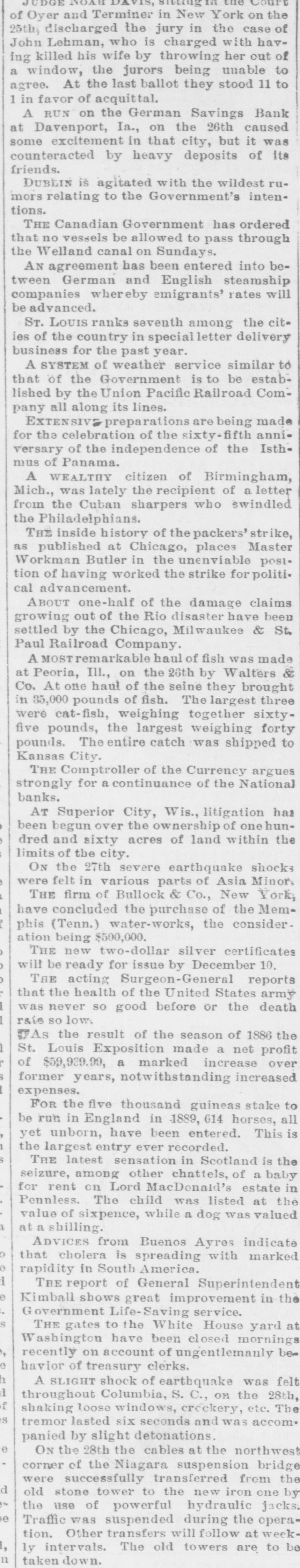 A SENSATIONAL REPORT. Rumors of a Bank Suspending in Davenport Said to have Originated in Rock Island. Manv wild and exciting rumors were afloat here, and in Davenport yesterday, concerning the alledged embarrassment and suspension of the well known Gers man savings bank at Davenport. Excitement became intense as the rumors spread, and much anxiety was expressed by those having deposits, in the institus tion, and business men generally. The reports were to the effect that for two weeks back there had been an unusual run on the bank, and that some of the heaviest depositors had withdrawn their funds, and placed them elsewhere. Others, it was stated, had de manded their money and the bank had been unable to meet them. On the day before Thanks giving $600 had been taken out by depositors on this side of the river alone. The Davenport daily Der Democrat. the German paper printed at Davenport, and the proprietor of which is president of the bank in question contained an extended article on the matter yesterday morning in which it was stated that the rumors were without the least foundation, and had their origin in the banks of Rock Island, the officers of which had used this method of preventing Rock Island people from depositing their money in the vaults of Davenport banks. Last evening President Lischer, of the German savings bank was interviewed. and he stated that, while the rumors had occasioned a little uneasiness among depositors and the withdrawing of some of the deposits, claimed that the bank had never been in in more prosperous condition than now, and was ready to meet any demands that might come upon it, no matter how urgent The German savings bank at Daven port has always been regarded as one of the soundest in the state of Iowa. Its directors are all successful business men, and careful financiers. and while these unfounded rumors will naturally prove in 8 measure detrimental to the bank, they will in no way cause it to shake. From the fact that the banks of Rock Island pay no interest on deposits, and the Davenport banks pay a rate of four and five per cent, it is not surprising that a great deal of the money of this city finds its way into the safekeeping of the banking houses across the river where a gain is realized by 80 doing.