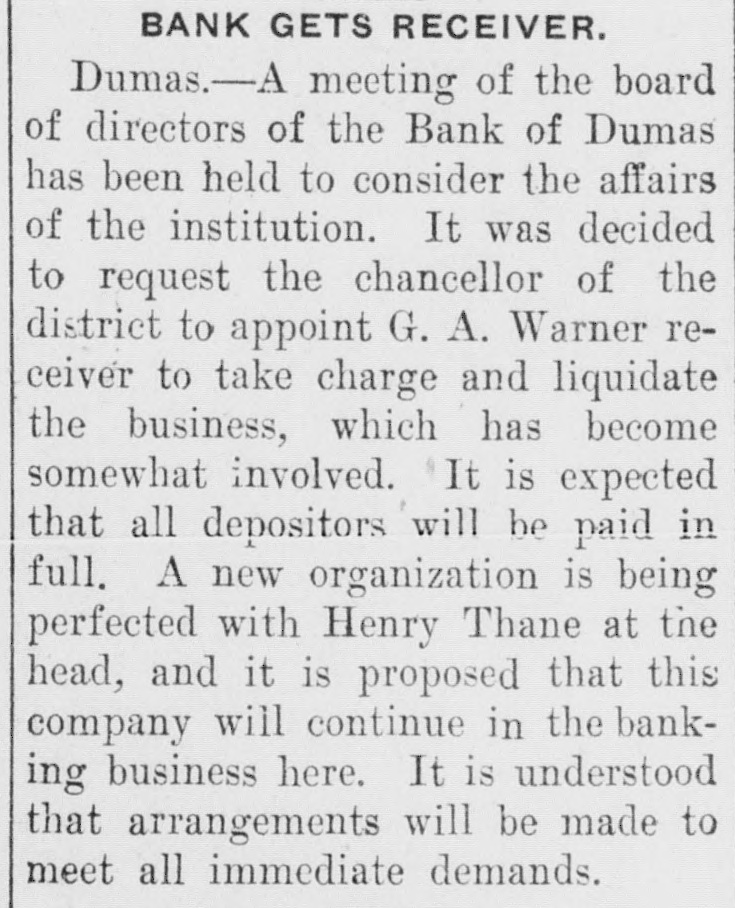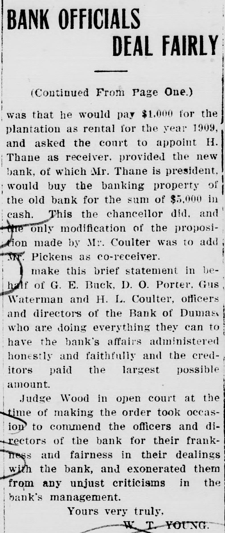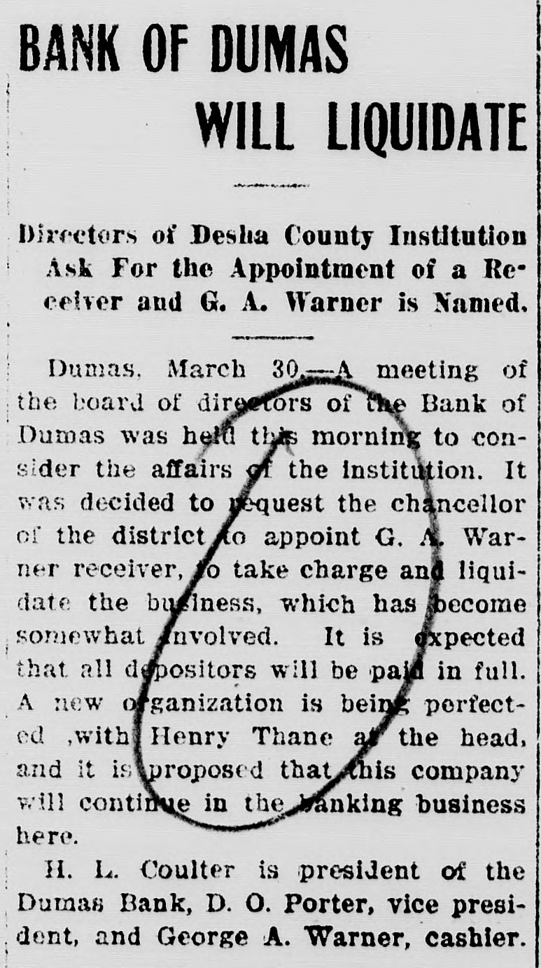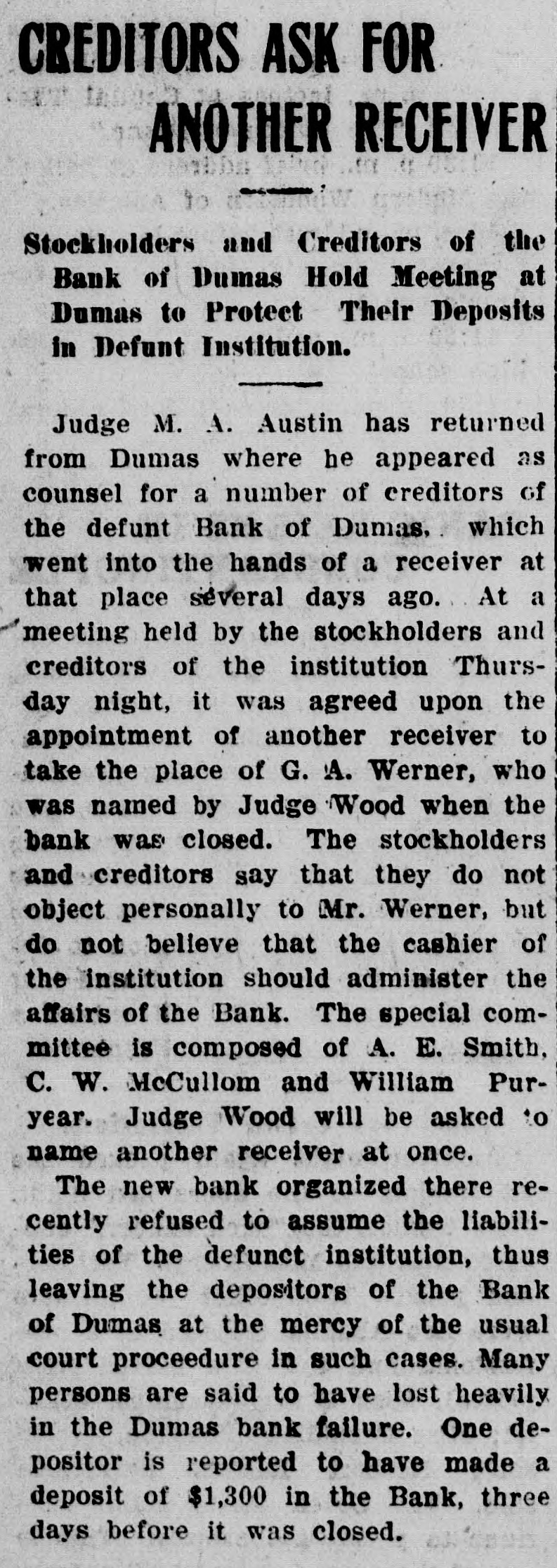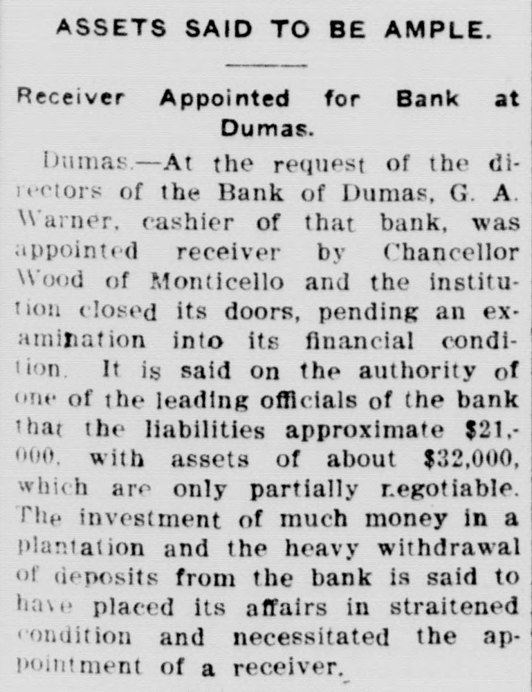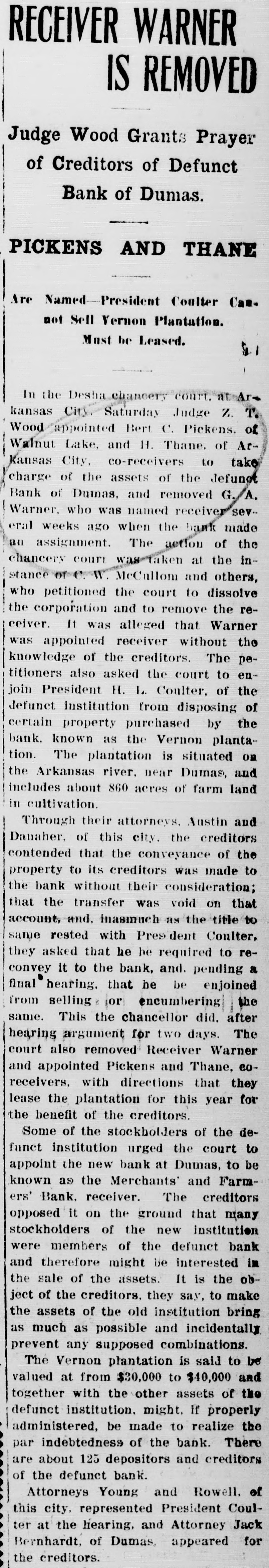 RECEIVER WARNER IS REMOVED Judge Wood Grants Prayer of Creditors of Defunct Bank of Dumas. PICKENS AND THANE Are Named President Coulter Can. not Sell Vernon Plantation. Must be Leased. In the Desha chancery court. T. kansas City Saturday Judge Z. Wood appointed Bert C. Pickens. of Walnut Lake, and H. Thane. of ArKansas City, co-receivers to take charge of the assets of the Jefunot A. Bank of Dumas, and removed G Warner. who was named receiver sev-eral weeks ago when the bank made an assignment. The action of the chancery court was taken at the instance of C. W. McCallom and others, who petitioned the court to dissolve the corporation and to remove the receiver. It was alleged that Warner was appointed receiver without the knowledge of the creditors. The petitioners also asked the court to enjoin President H. 1. Coulter, of the defunct institution from disposing of certain property purchased by the bank. known as the Vernon plantation. The plantation is situated on the Arkansas river. near Dumas, and includes about 860 acres of farm land in cultivation. Through their attorneys. Austin and Danaher. of this city. the creditors contended that the conveyance of the property to its creditors was made to the bank without their consideration; that the transfer was void on that account, and, inasmuch as the title to same rested with President Coulter, they asked that he be required to reconvey it to the bank, and. pending a final hearing. that he be enjoined the from selling or encumbering same. This the chancellor did. after hearing argument for two days. The court also removed Receiver Warner and appointed Pickens and Thane, eoreceivers, with directions that they lease the plantation for this year for the benefit of the creditors. Some of the stockholders of the defunct institution urged the court to appoint the new bank at Dumas, to be known as the Merchants' and Farmers' Bank. receiver. The creditors opposed it on the ground that many stockholders of the new institution were members of the defunct bank and therefore might be interested in the sale of the assets. It is the object of the creditors. they say, to make the assets of the old institution bring as much as possible and incidentally prevent any supposed combinations. The Vernon plantation is said to be valued at from $30,000 to $40,000 and together with the other assets of the defunct institution. might. if properly administered, be made to realize the par indebtedness of the bank. There are about 125 depositors and creditors of the defunct bank. Attorneys Young and Rowell. of this city, represented President Coulter at the hearing, and Attorney Jack Bernhardt, of Dumas, appeared for the creditors.