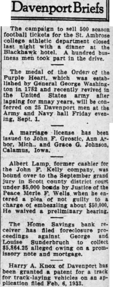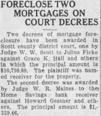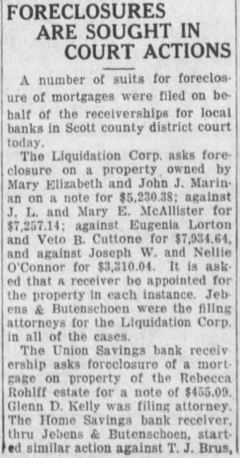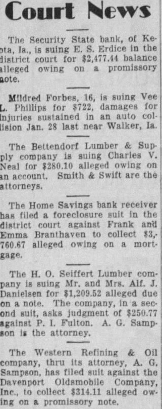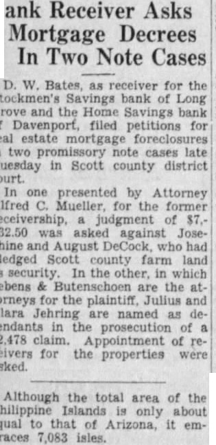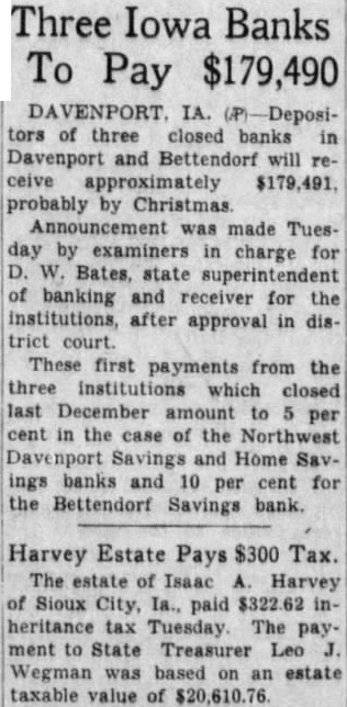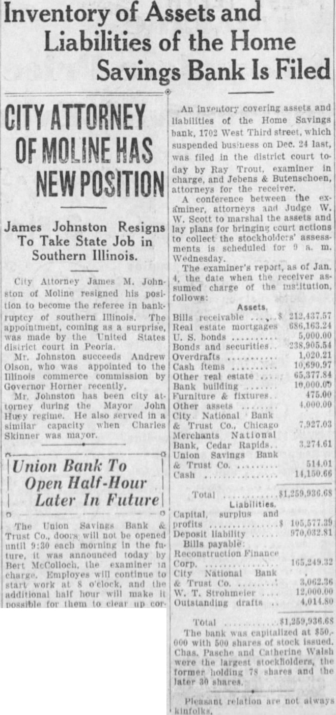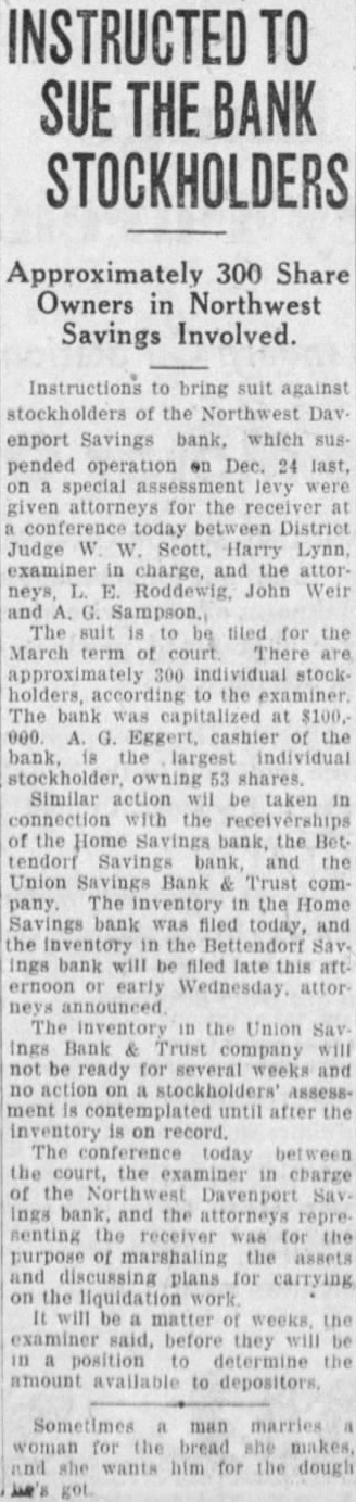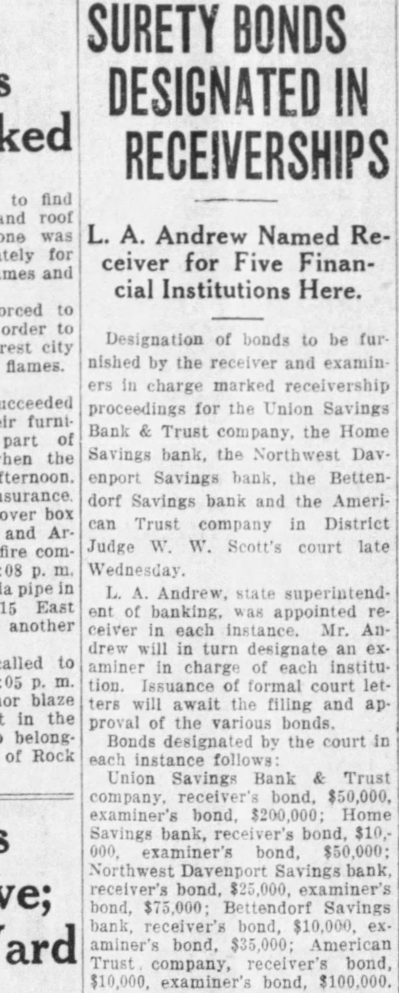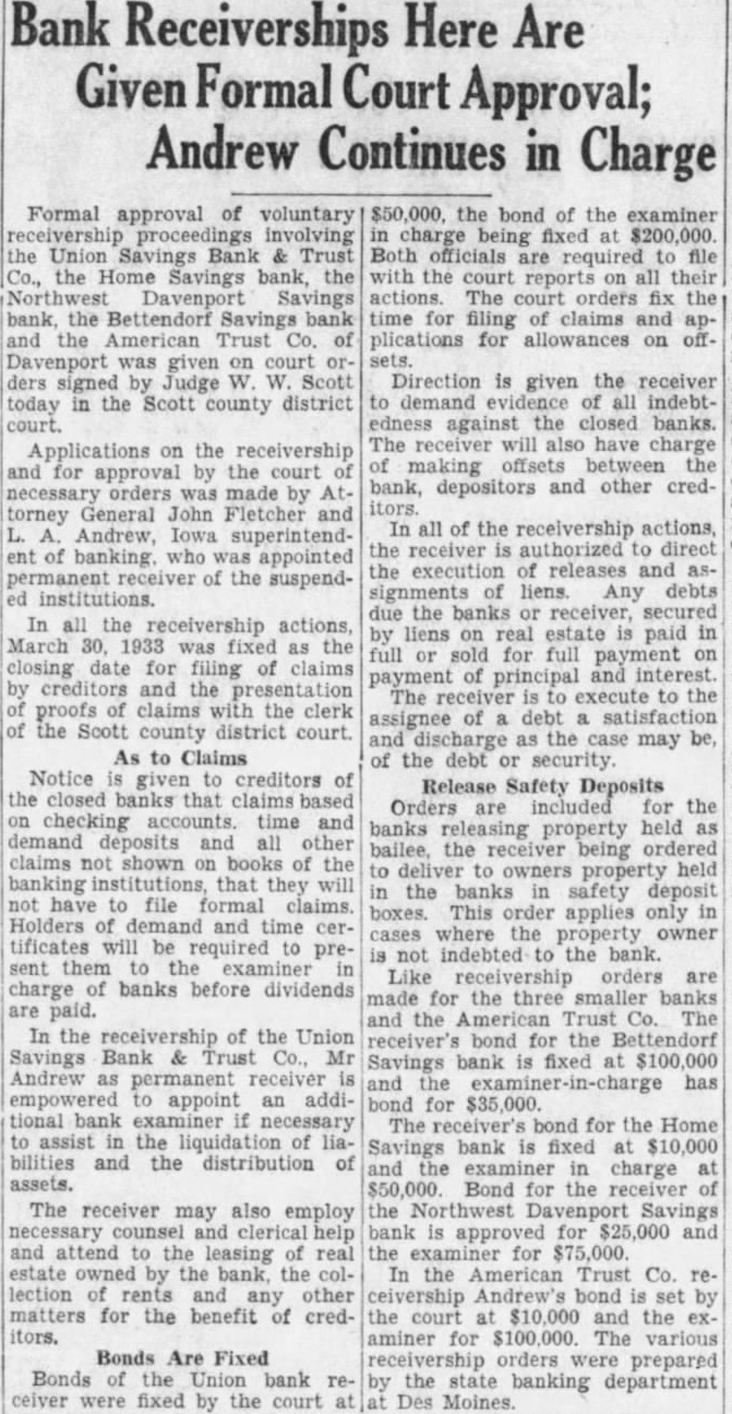 Formal approval of voluntary involving the Union Savings Bank Trust Co., the Home Savings bank, the Davenport Savings bank, the Bettendorf Savings bank and the American Trust Co. of Davenport was given court orders signed by Judge Scott today in the Scott county district court. Applications on the receivership and for approval by the court necessary orders was made by Attorney General John Fletcher and Andrew, Iowa superintendent of banking. who was appointed permanent receiver of the suspendinstitutions. In all the receivership actions, March 30 1933 was fixed as the closing date for filing of claims creditors and the presentation proofs of claims with the clerk the Scott county district court. As to Claims Notice given to creditors of the closed banks that claims based on checking accounts. time and demand deposits and all other claims not shown on books of the banking institutions, that they will not have to file formal claims. Holders of demand and time certificates will be required to present them to the examiner charge of banks before dividends are paid. In the receivership of the Union Savings Bank Trust Co., Mr Andrew as permanent receiver empowered appoint an additional bank examiner if necessary assist in the liquidation of liabilities and the distribution of assets. The receiver may also employ necessary counsel and clerical help and attend to the leasing of real estate owned by the bank, the lection of rents and any other matters for the benefit of creditors. the bond of the examiner in charge being fixed at $200,000. Both officials are to file with the court reports on all their actions. The court orders fix the time for filing of claims and applications for allowances on offsets. Direction is given the receiver to demand evidence of all indebtedness against the closed banks. The receiver will also have charge of making offsets between the bank, depositors and other creditors. In all of the receivership actions, the receiver is authorized to direct the execution of releases and assignments liens. Any debts due the banks or receiver, secured by liens on real estate is paid in full or sold for full payment on payment of principal and interest. The receiver to execute to the assignee of debt a satisfaction and discharge as the case may be, of the debt or security. Release Safety Deposits Orders included for the banks releasing property held bailee, the receiver being ordered to deliver to owners property held in the banks in safety deposit boxes. This order applies only in cases where the property owner not indebted to the bank. Like receivership orders are made for the three smaller banks and the American Trust Co. The receiver's bond for the Bettendorf Savings bank is fixed at $100,000 and the examiner-in-charge has bond for $35,000. The receiver's bond for the Home Savings bank is fixed at $10,000 and the examiner in charge $50,000 Bond for the receiver of the Northwest Davenport Savings bank approved for $25,000 and the examiner for $75,000. In the American Trust Co. receivership Andrew's bond set by the court at $10,000 and the examiner for $100,000. The various Bonds Are Fixed receivership orders were prepared Bonds of the Union bank rethe state banking department ceiver were fixed by the court Des Moines.