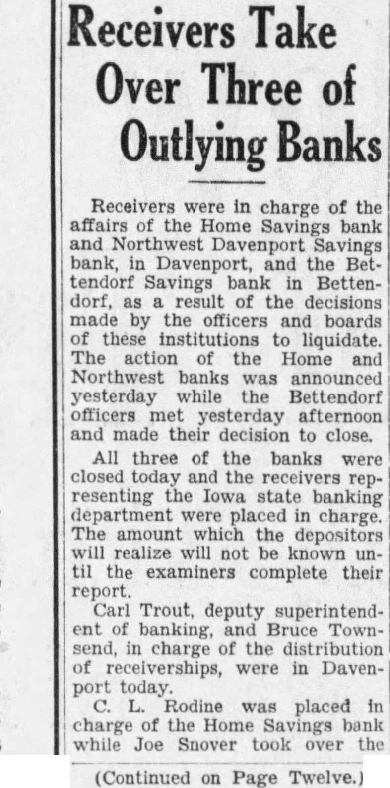 Receivers were in charge of the affairs of the Home Savings bank and Northwest Davenport Savings bank, Davenport, and the Bettendorf Savings bank in Bettendorf, result of the decisions made by officers and boards these institutions to liquidate. The action of the Home and Northwest banks was announced yesterday while the Bettendorf officers met yesterday afternoon and made their decision to close. All three of the banks were closed today and the receivers resenting the Iowa state banking department were placed in charge. The amount which the depositors will realize will not be known til the examiners complete their report. Carl Trout, deputy superintendent of banking, and Bruce send, charge of the distribution receiverships, were in Daventoday. Rodine was placed charge of the Home Savings bank while Joe Snover took over the