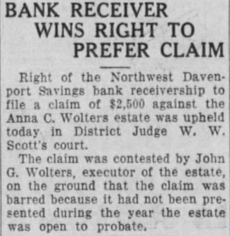 Right of the Northwest Davenport Savings bank receivership claim of $2,500 against Anna Wolters estate upheld today District Judge court. claim contested by John Wolters, executor of the estate, the ground that claim was barred because had not been sented during the year the estate to probate.