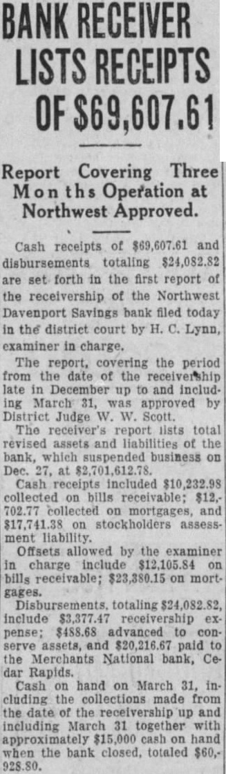 Cash receipts of and disbursements totaling $24,082.82 set the first report the receivership of the Northwest Davenport Savings bank filed today the district court Lynn, examiner in charge. The report, covering the period from date of the December and includMarch 31, approved Judge W. Scott. The report lists total revised assets of the bank, suspended business Dec. 27, Cash included collected bills receivable: $12,702.77 mortgages, on stockholders assessliability. Offsets allowed by the examiner charge include receivable; gages. Disbursements. totaling include receivership expense; $488.68 advanced conassets, and $20,216.67 paid the Merchants National bank, CeRapids. Cash on hand on March 31, cluding the collections made the the and including March together with cash hand the bank closed, totaled