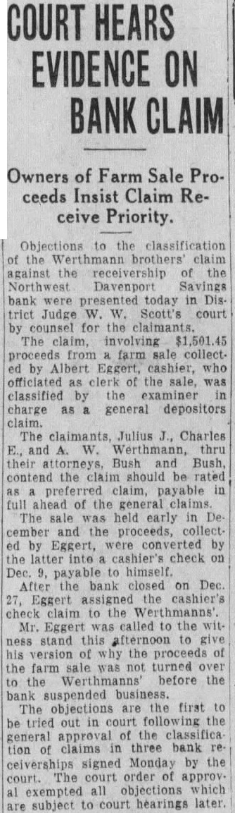 Objections the classification of the Werthmann brothers claim against receivership the Northwest Davenport Savings bank presented today in DisJudge W. Scott's court counsel for the claimants. The claim, involving proceeds from farm sale collect. by Albert Eggert, cashier, officiated clerk of the sale, was classified by examiner charge general depositors claim. The claimants, Julius Charles and Werthmann, thru their Bush Bush, contend the should be rated claim, ahead of the claims. The held early the collect by Eggert, were the latter into cashier's check payable to After bank closed on Dec Eggert assigned cashier's check claim to the Werthmanns Mr. Eggert was called to the witness stand this afternoon his version of the proceeds of the farm sale was not turned over Werthmanns' before the bank suspended business The objections are first tried out in court the general approval of the classifica tion of claims three bank ceiverships signed Monday by the court. The court order of approv. exempted all objections which subject to court hearings later.