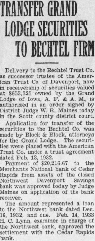 Delivery to the Bechtel Trust Co. of the AmerTrust Co. of now securities valued owned by the Grand Lodge order signed by District today the Scott county district court. Application for transfer of the Bechtel Co. was made Block Block, attorneys for the Grand Lodge. The securiwere placed with the American Trust Co. under trust agreement Feb. 13, 1932. Payment of $20,216.67 to the Merchants National bank of Cedar Rapids from assets of the closed Northwest Davenport Savings bank approved today Judge Maines on application of the bank receiver. The amount represented loan the Northwest bank dated Dec. 1932, due. Feb. 1933 Lynn, examiner in charge bank, the with the Cedar Rapids bank.