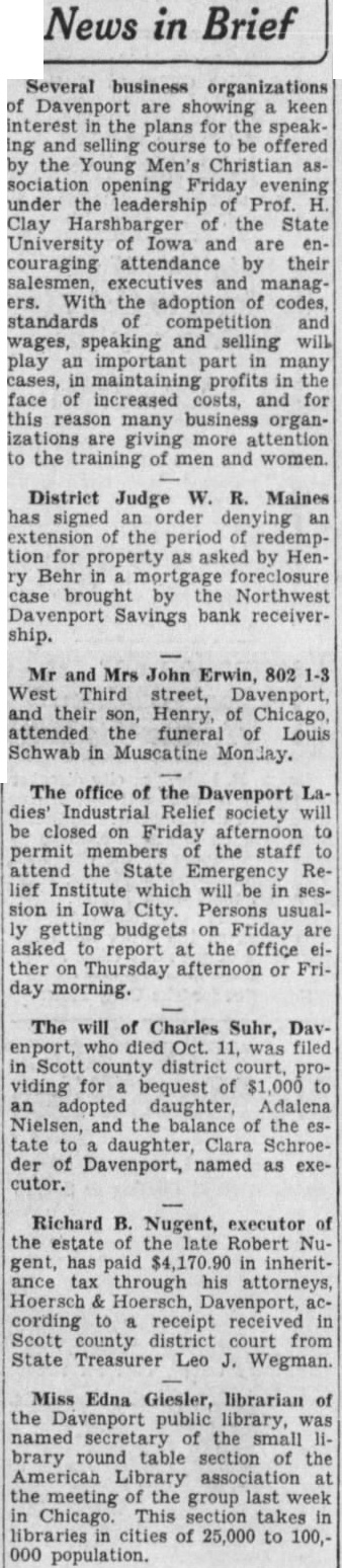 Mr and Mrs John Erwin, 802 West Third street, Davenport, and their son, Henry, of Chicago, attended funeral of Louis Schwab in Muscatine Monday.