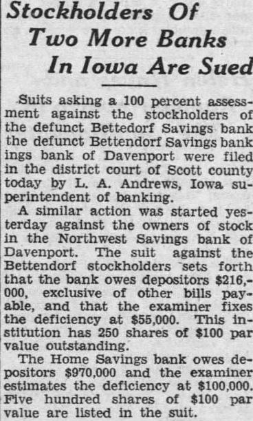 Suits asking 100 percent assessment against the stockholders the defunct Bettedorf Savings bank the defunct Bettendorf bank bank Davenport were filed the district court of Scott county today by Andrews, Iowa of banking. similar action was started yesterday against the owners stock the Northwest Savings bank of Davenport. The against the Bettendorf stockholders sets forth that the bank owes depositors exclusive of other bills and that the examiner the deficiency This stitution has 250 shares of par outstanding. The Home Savings bank owes positors and the examiner the deficiency $100,000. hundred shares $100 par are listed in the suit.