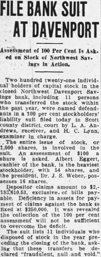Instructions to bring suit against stockholders of the Northwest Dav enport Savings bank, which pended operation en Dec. 24 last, special levy for the today District Judge Harry Lynn, examiner in charge, the neys, John The tiled for the March term of There approximately individual stockholders, according the The bank capitalized at $100.Eggert, cashier of the bank, the largest individual stockholder. owning shares. Similar action will taken connection with the of the Home bank, the tendorf Savings and the Union Bank Trust pany. The the Home Savings bank was filed today, and the ings bank will filed ernoon Wednesday. attor the Union ings Bank Trust company ready for several contemplated until after inventory record. The conference today the court, the examiner Davenport bank, and the attorneys senting the receiver for marshaling the assets discussing plans for the work. matter examiner said, before they position determine available depositors, man woman bread wants him