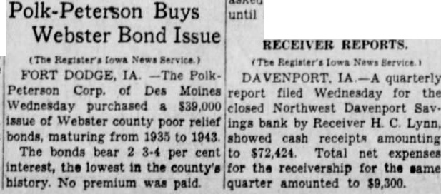 (The DAVENPORT quarterly Peterson Corp. of Des Moines report filed Wednesday for the Wednesday purchased $39,000 closed Northwest Davenport Sav. issue of Webster county poor relief ings bank by Receiver H. Lynn, bonds, maturing from 1935 to 1943 showed cash receipts amounting The bonds bear 3-4 per cent $72,424. Total net expenses interest, the lowest in the county's for the receivership for the same history. No premium was paid amounted to $9,300.