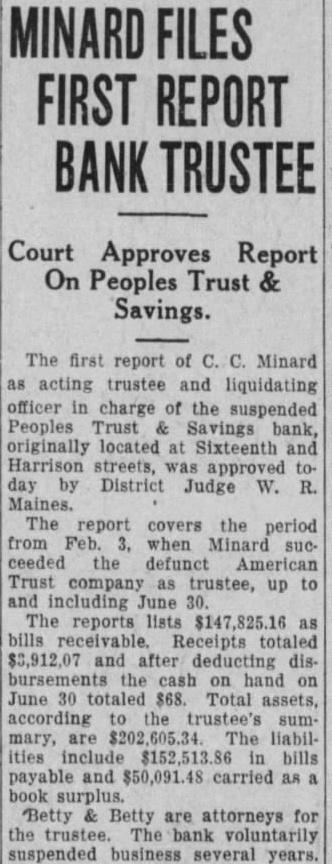 FIRST REPORT Court Approves Report On Peoples Trust & Savings. The first report of Minard acting trustee and liquidating officer in charge of the suspended Peoples Trust Savings bank, originally located Sixteenth and Harrison streets, approved day District Judge Maines. The report covers the period from Feb. when Minard ceeded the defunct American Trust company trustee, up including June The reports lists Receipts totaled after deducting disbursements cash on hand on June totaled $68. Total assets, according trustee's summary, The liabilities include $152,513.86 in and carried surplus. Betty Betty are attorneys for the The bank voluntarily suspended business several years.