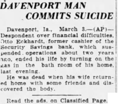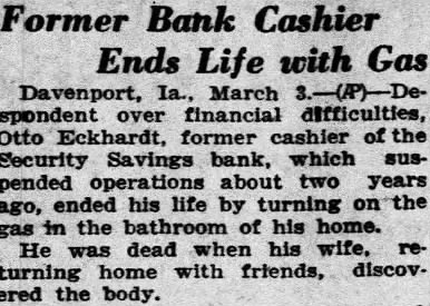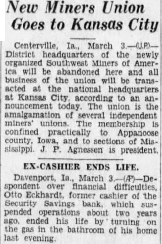 New Miners Union Goes to Kansas City Centerville, March District headquarters of the newly Southwest Amerwill abandoned and all the union transacted national Kansas to an The amalgamation miners' membership confined practically Appanoose county, and of Mississippi. Agnessen president. EX-CASHIER ENDS LIFE. Davenport, March financial Otto former cashier of the Security Savings bank, which suspended operations about two years ended by turning the bathroom of his home last